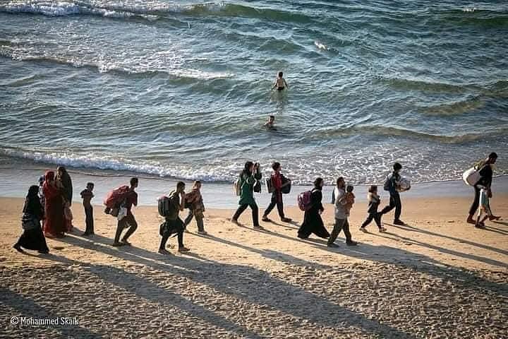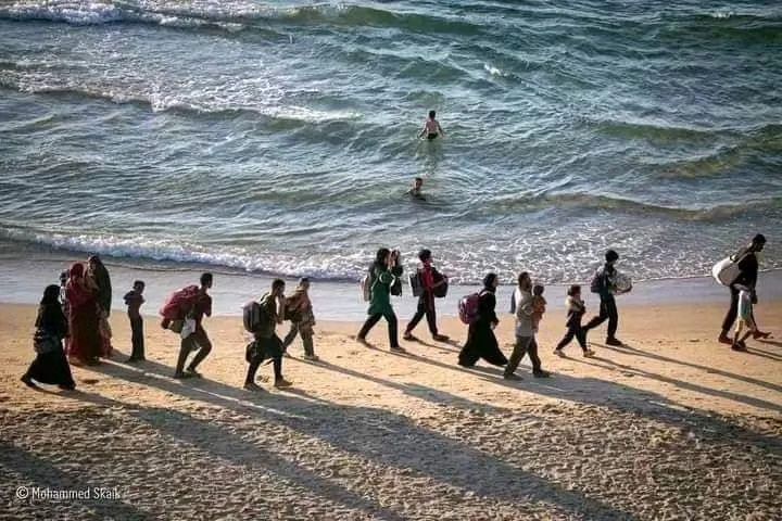 هنا غزة .. وهنا ما يسمى بالمنطقة الآمنة..! النازحون تحلق الطائرات فوق رؤوسهم، وتتساقط عليهم حمم الصواريخ، بينما البحر يحاصرهم من اليسار والدبابات تقترب من اليمين.