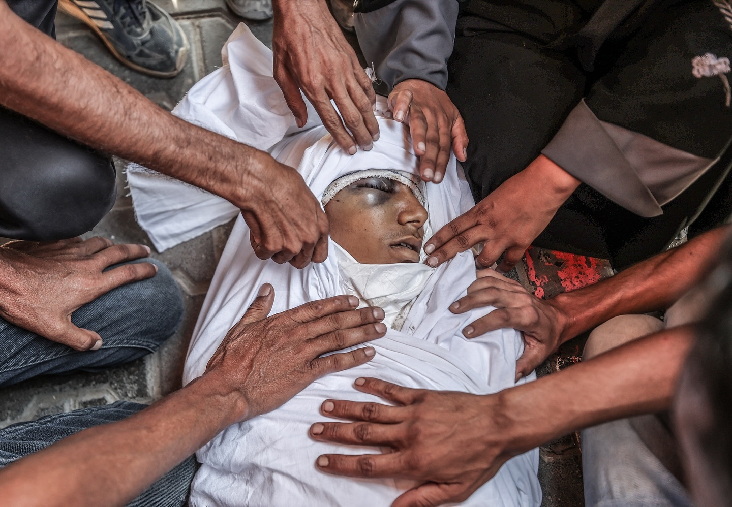 A body of a Palestinian, who lost his life due to Israeli attack, is brought to al-Aqsa Martyrs Hospital in Deir al-Balah, Gaza. (Photo by Ali Jadallah/Anadolu via Getty Images)