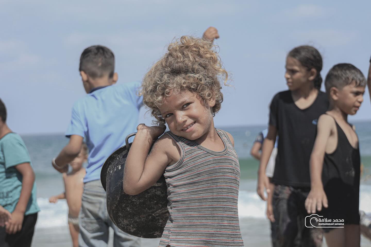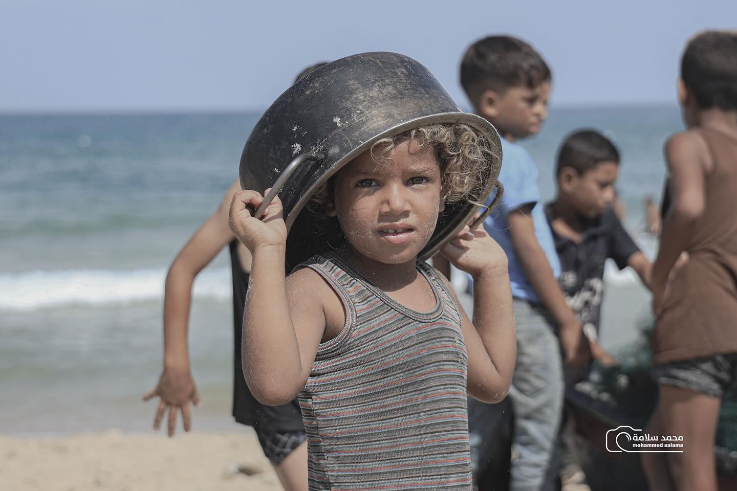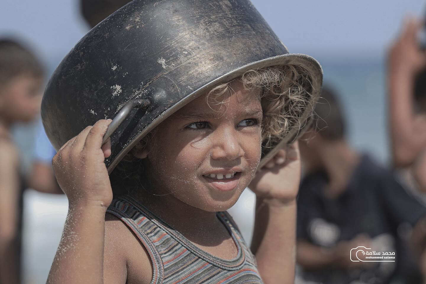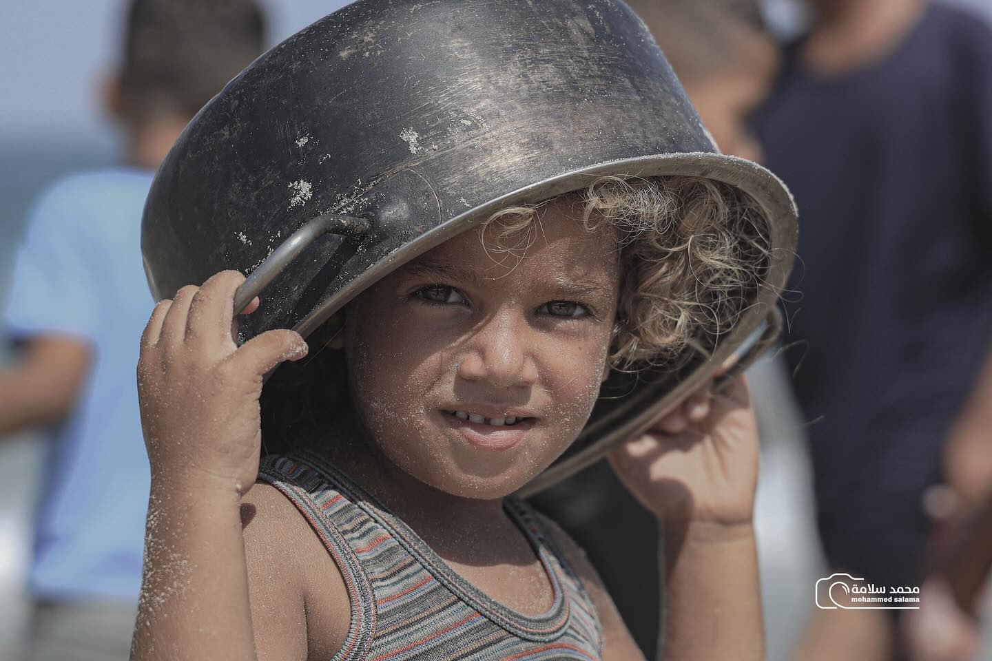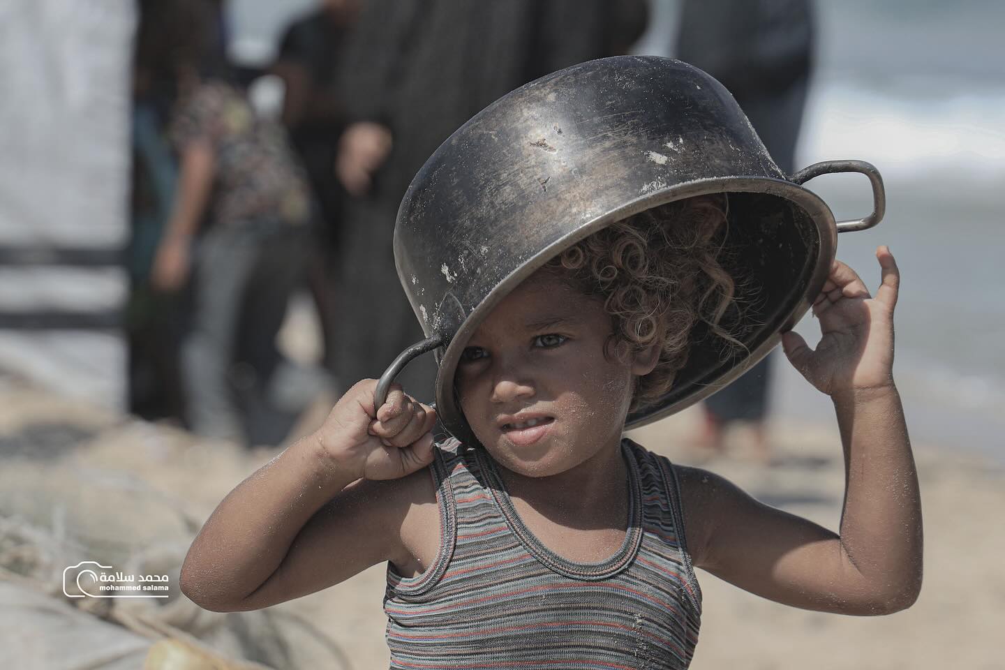 طفلةٌ صغيرة بشعر أشقر وعينين خضراوين، تحمل قدر الطعام بجانبها، تتحدى بصمتها كل التحديات... حتى لبسها يحمل آثار معركة يومية من أجل البقاء. A little girl with blond hair and green eyes, holding a food bowl, silently defies all challenges. Even her clothes bear the marks of a daily battle for survival.