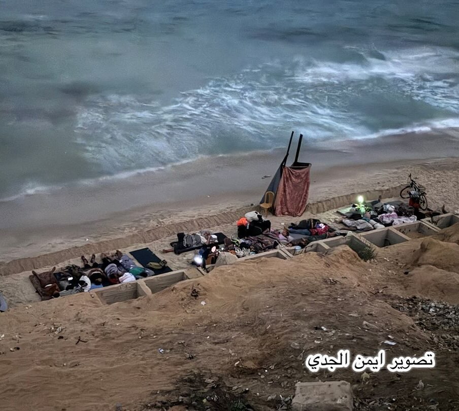 Displaced Palestinian families spend their night on the beach after they were forcibly displaced by the occupation forces in Gaza. By @ayman_al_gedi مواطنون نازحون ينامون على شاطئ البحر بعد تهجيرهم من قبل الاحتلال في قطاع غزة