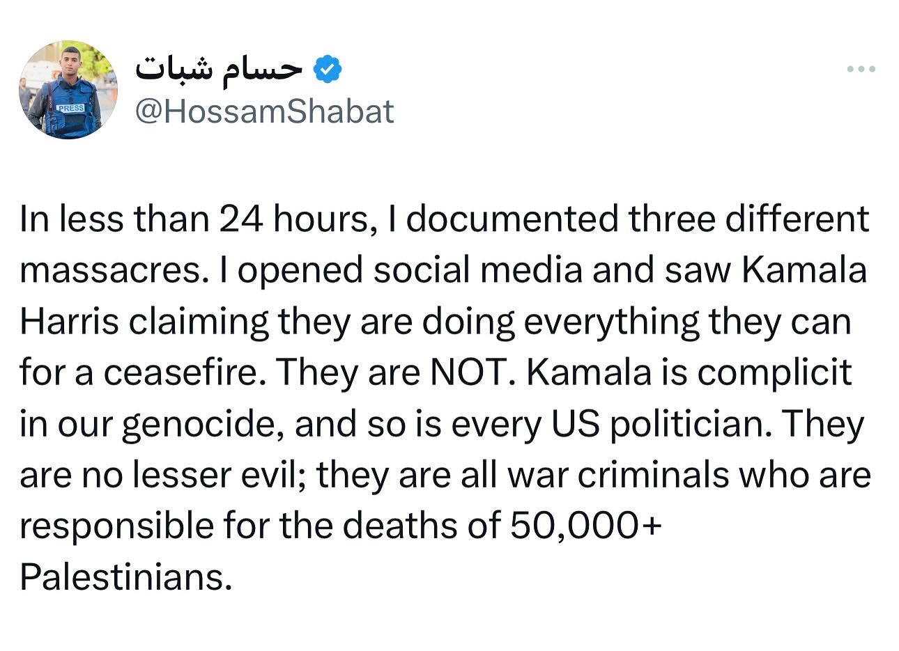 In less than 24 hours, I documented three different massacres. I opened social media and saw Kamala Harris claiming they are doing everything they can for a ceasefire. They are NOT. Kamala is complicit in our genocide, and so is every US politician. They are no lesser evil; they are all war criminals who are responsible for the deaths of 50,000+ Palestinians.