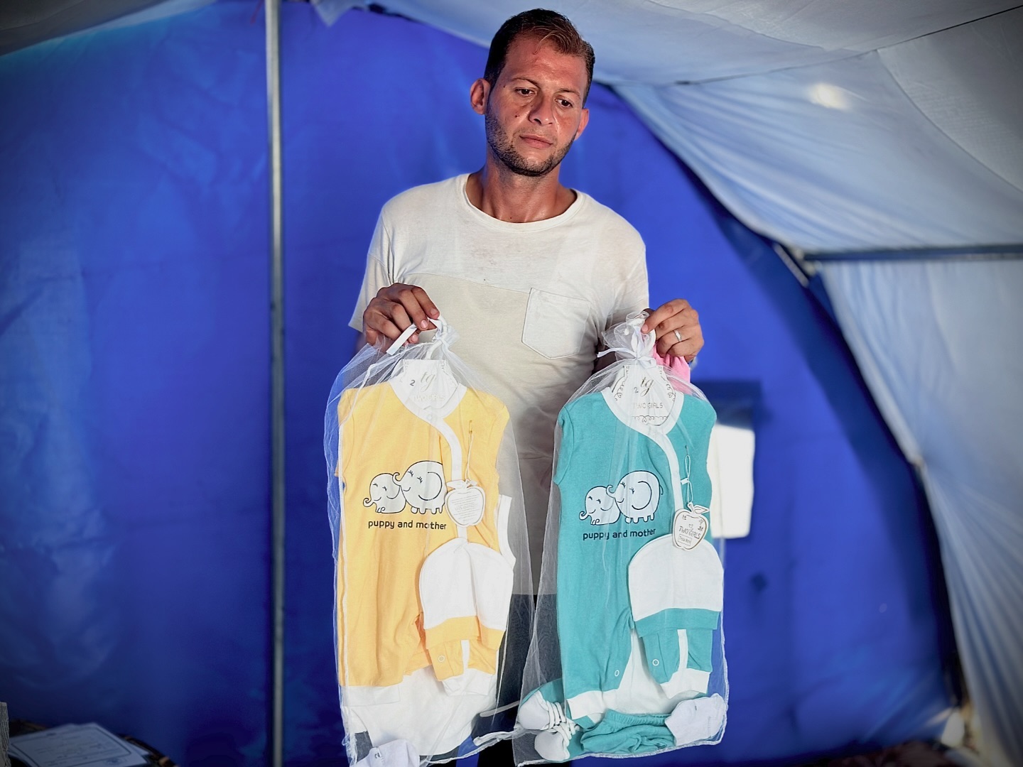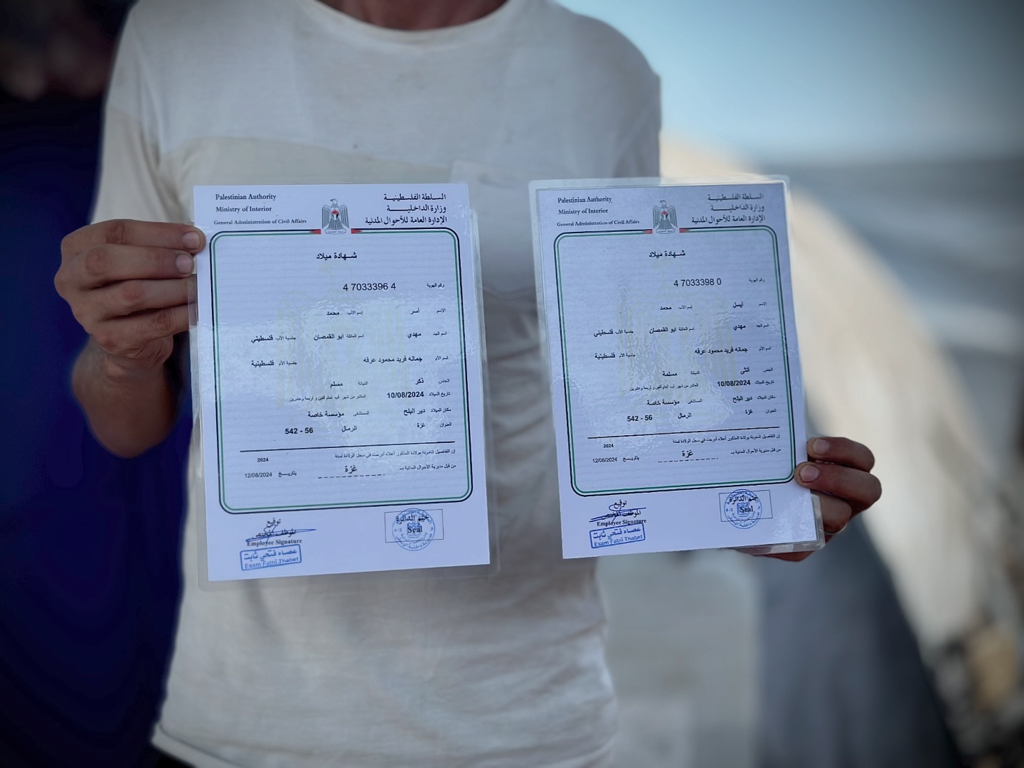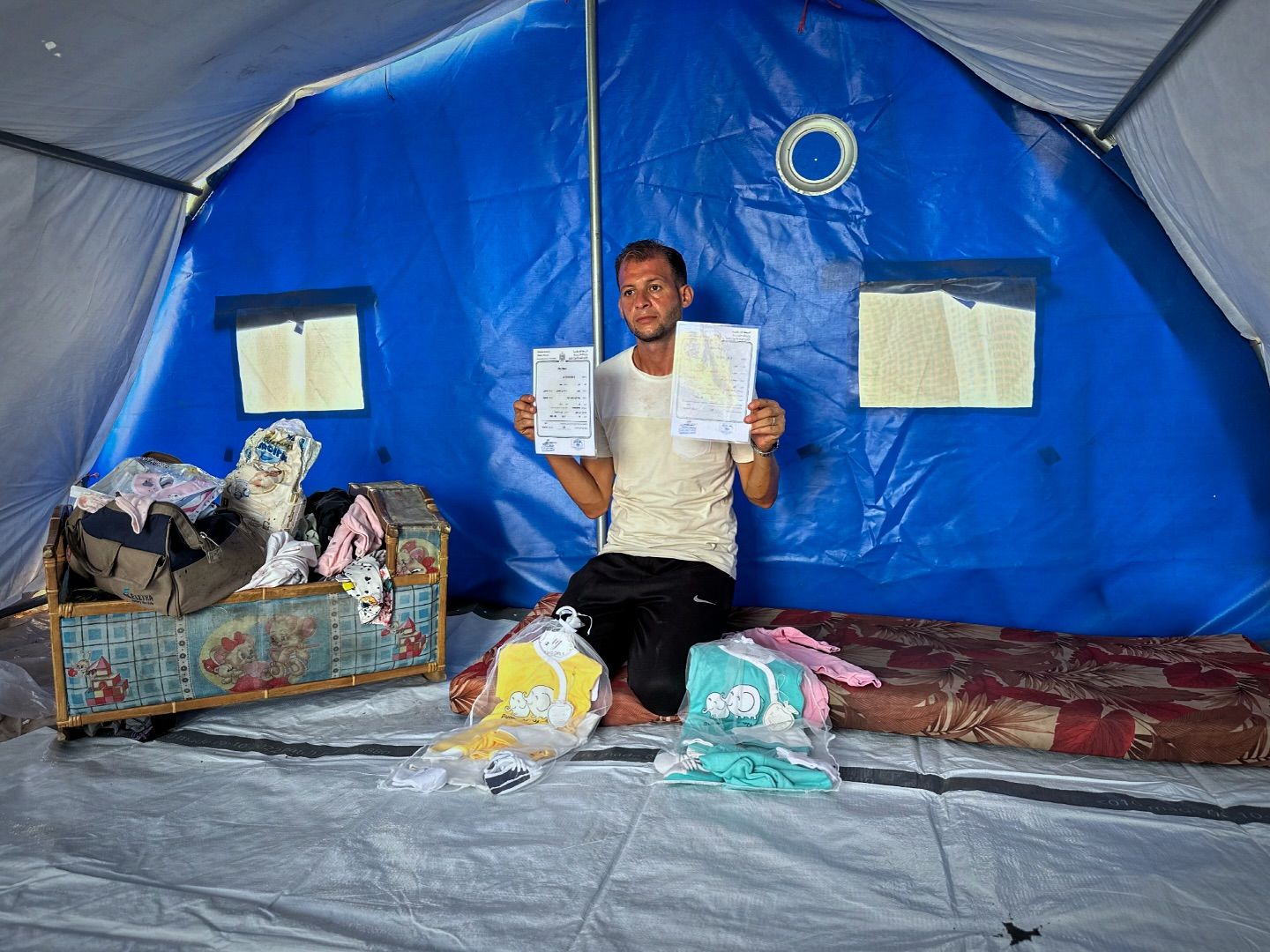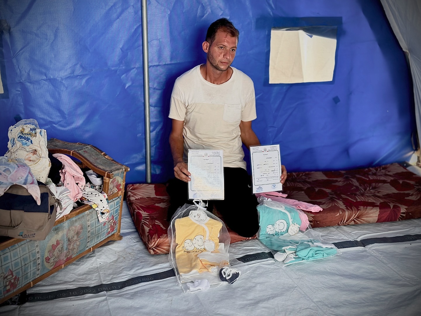 Muhammad Abu Al-Qumsan, who was displaced from the northern Gaza Strip to the city of Deir Al-Balah in the central Gaza Strip, went to obtain birth certificates for his son and daughter who were born four days ago, but an Israeli raid on their place of residence claimed their lives and the lives of his wife and her mother.