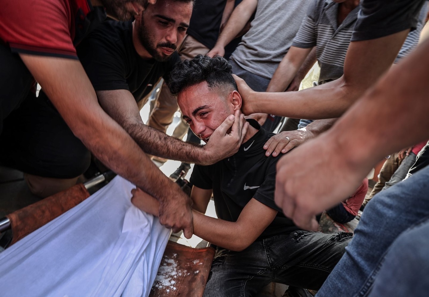 Relatives of the deceased mourn their loss as the bodies are brought to Al Aqsa Martyrs Hospital for funeral prayer and burial after at least 5 Palestinians died in an Israeli attack on Maghazi refugee camp in Deir al Balah, Gaza. (Photo by Ali Jadallah/Anadolu via Getty Images)