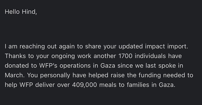 I’ve been feeling quite down and helpless these past few days, but then I received this email from my WFP team🇺🇳🌾 Let’s continue supporting more Palestinian families—link in my bio 🤍