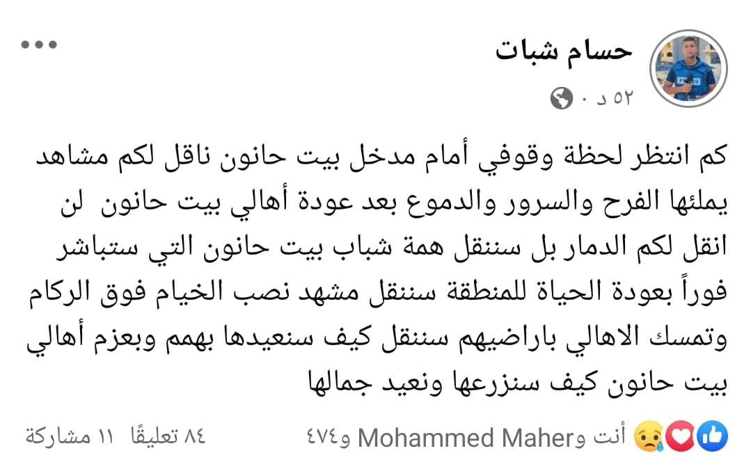 How much I long for the moment of standing at the entrance of Beit Hanoun, witnessing scenes filled with joy and tears after the return of the people of Beit Hanoun. I won't convey to you the devastation; instead, I will convey the determination of the youth of Beit Hanoun, who will immediately begin rebuilding life in the area. We will witness scenes of tents being set up over the rubble, and the people clinging to their land. I will convey how they will bring back happiness with their determination, and with the determination of the people of Beit Hanoun, how we will replant it and restore its beauty. Beit Hanoun - بيت حانون