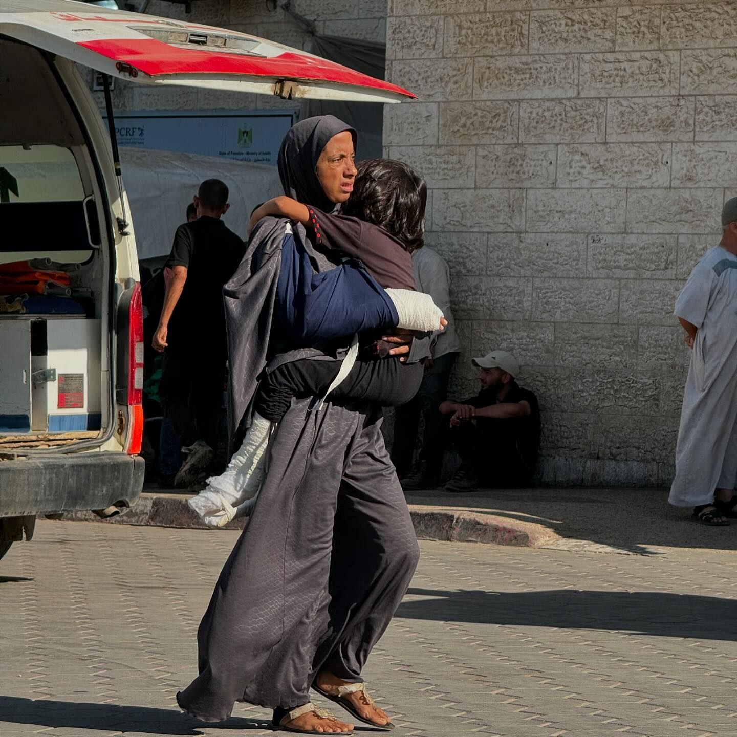 A Palestinian woman holds her injured child during an Israeli bombing on Deir al-Balah in the middle of Deir al-Balah. سيدة فلسطينية تحمل طفلتها المصابة خلال قصف اسرائيلي على دير البلح وسط دير البلح .. By @abdalhkem_abu_riash