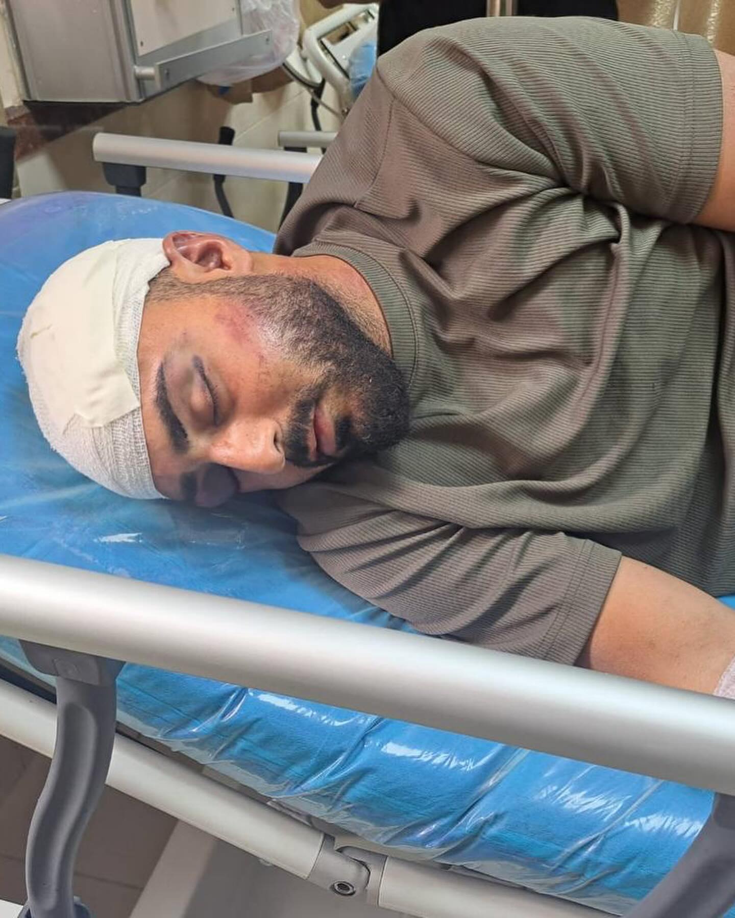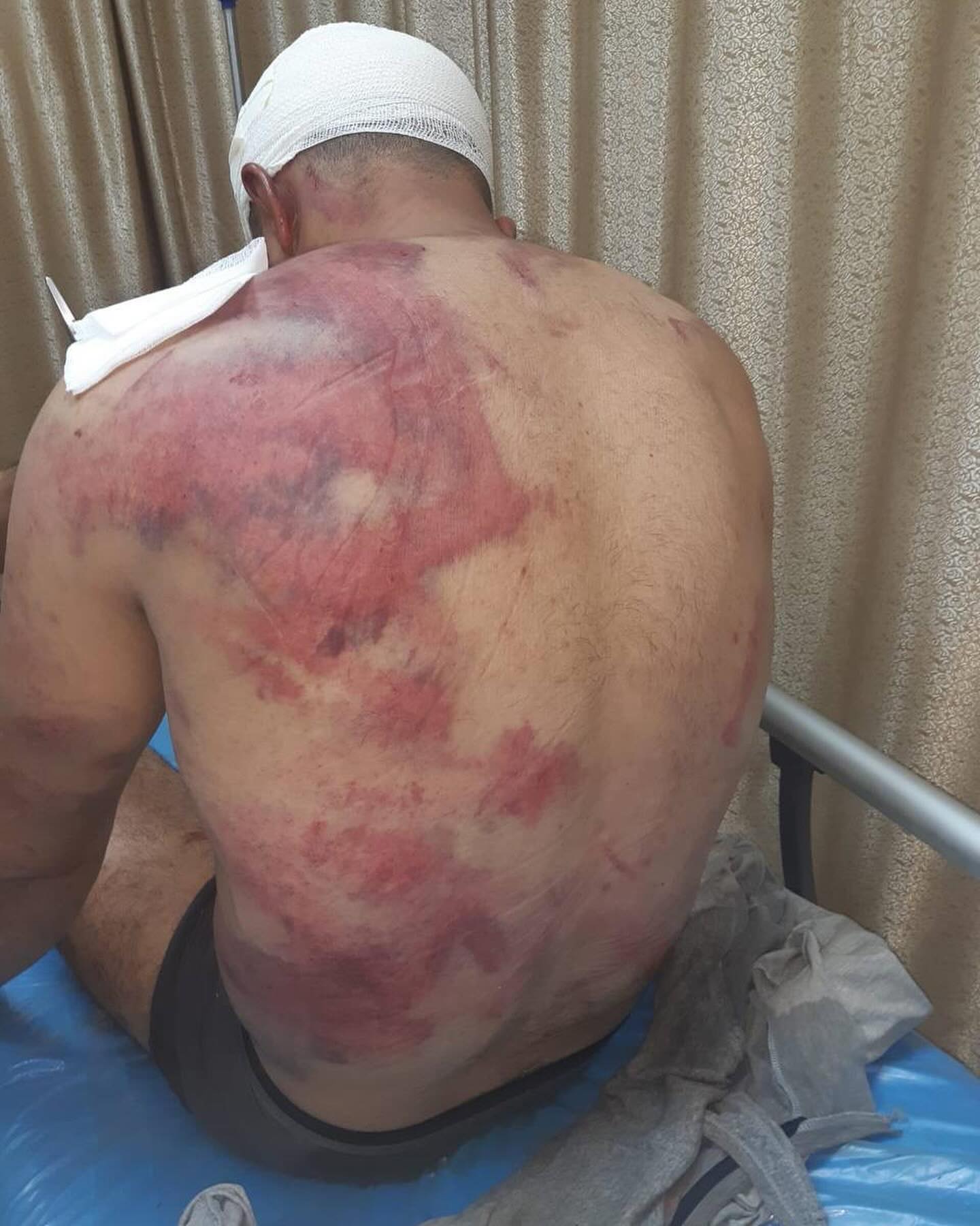 Masked Israeli soldiers abducted this Palestinian man from Al-Auja town north of Jericho, brutally beat him, and then left him at Al-Hamra military checkpoint in the northern Jordan Valley. جنود ملثمون من جيش الاحتلال يهاجمون منطقة العوجا شمال أريحا، ويختطفون شاباً ويبرحونه ضرباً ويلقونه قرب حاجز الحمرا بالأغوار الشمالية.