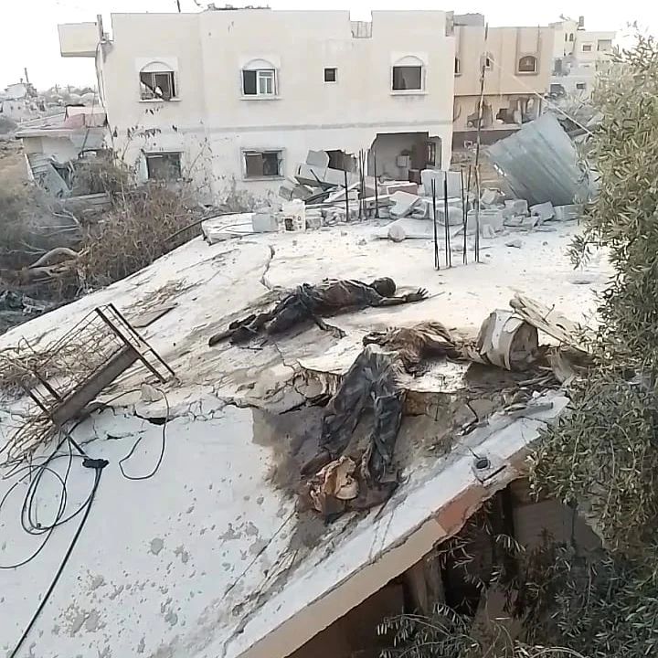 . Among the war crimes committed by the occupation forces in Gaza, where the decomposed bodies of citizen Imad Abu Eid and his wife, who was seven months pregnant, were found after they were hanged by Israeli soldiers and their bodies were thrown on the roof of a house in Khan Yunis. !!! ومن بين جرائم الحرب التي ارتكبتها قوات الاحتلال في غزة، العثور على جثث متحللة للمواطن عماد أبو عيد وزوجته الحامل في شهرها السابع، بعد أن أعدم؛؛هما جنود الاحتلال ش::نقاً وألقى جثتيهما على سطح أحد المنازل في خانيونس.
