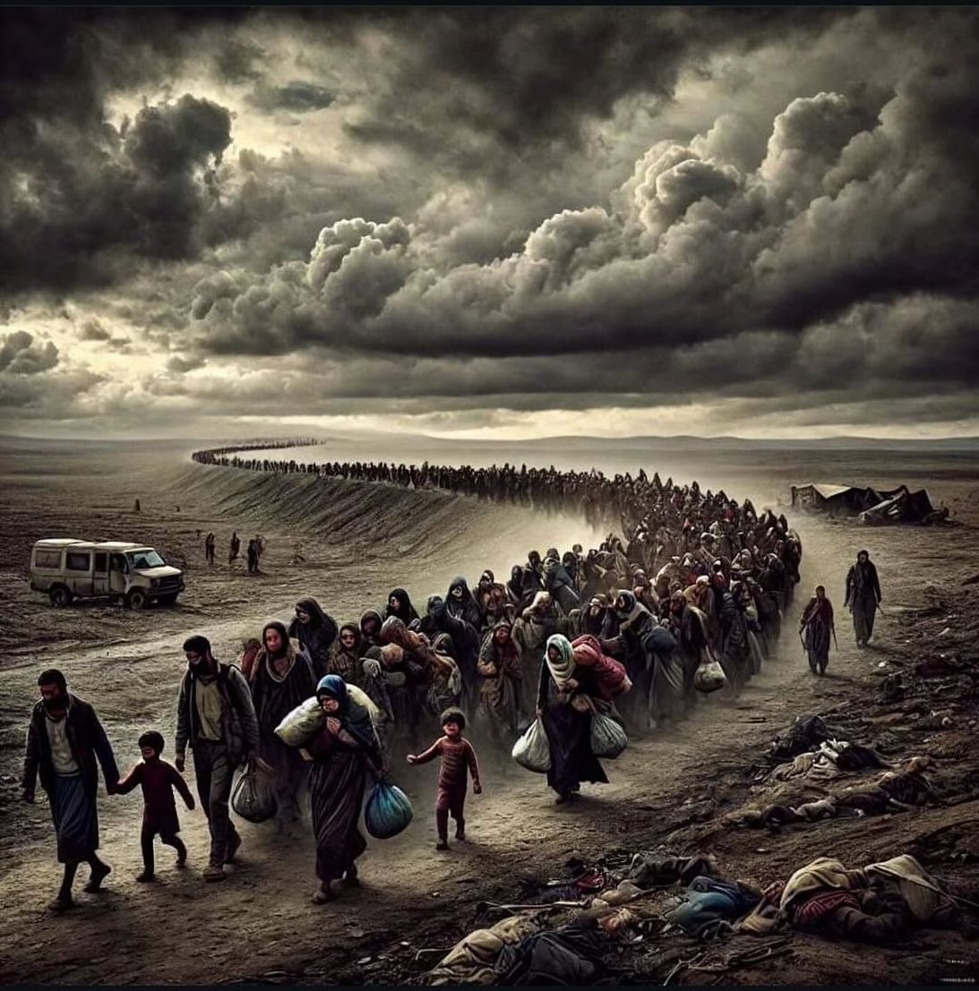 نزوح مؤلم يجسد معاناة أهالي غزة في ظل تهديد إخلاء بلوك ١٢٨ الذي يضم مستشفى شهداء الأقصى في دير البلح .. صورة تعكس الألم والتشرد والبحث عن الأمان في وطن محاصر من جميع الجهات …💔