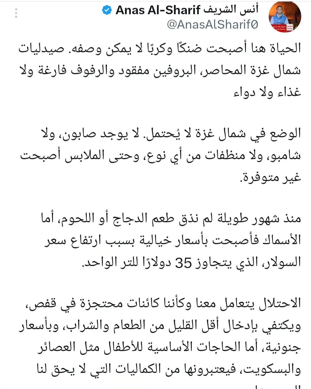 الحياة هنا أصبحت ضنكًا وكربًا لا يمكن وصفه. صيدليات شمال غزة المحاصر، البروفين مفقود والرفوف فارغة ولا غذاء ولا دواء الوضع في شمال غزة لا يُحتمل. لا يوجد صابون، ولا شامبو، ولا منظفات من أي نوع، وحتى الملابس أصبحت غير متوفرة. منذ شهور طويلة لم نذق طعم الدجاج أو اللحوم، أما الأسماك فأصبحت بأسعار خيالية بسبب ارتفاع سعر السولار، الذي يتجاوز 35 دولارًا للتر الواحد. الاحتلال يتعامل معنا وكأننا كائنات محتجزة في قفص، ويكتفي بإدخال أقل القليل من الطعام والشراب، وبأسعار جنونية، أما الحاجات الأساسية للأطفال مثل العصائر والبسكويت، فيعتبرونها من الكماليات التي لا يحق لنا التمتع بها. عشرات المرضى والجرحى بحاجة ماسة لعمليات جراحية، وللأسف، يتوفون أو تتفاقم معاناتهم يوماً بعد يوم. أغلب من أعرفهم أصيبوا بالكبد الوبائي (الريقان)، والنصف الآخر عانى من أمراض جلدية لم نرها من قبل.