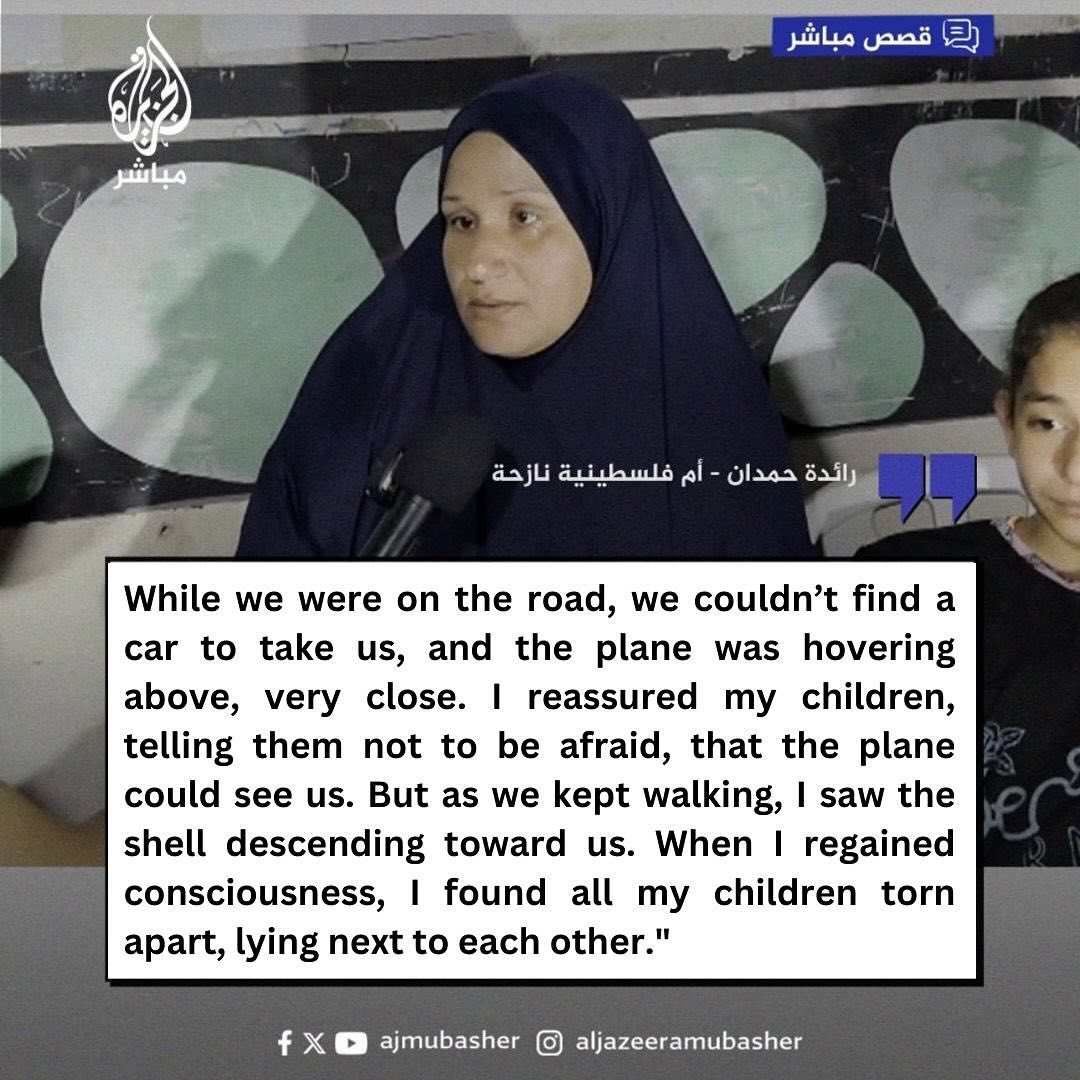 I interviewed Raeda Hamdan today. She told me how all seven of her children were killed right before her eyes as they were on “the safe road” trying to escape.
