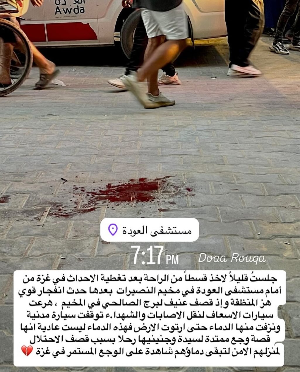 جلستُ قليلاً لاخذ قسطاً من الراحة بعد تغطية الاحداث في غزة من أمام مستشفى العودة في مخيم النصيرات بعدها حدث انفجار قوي هز المنظقة وإذ قصف عنيف لبرج الصالحي في المخيم، هرعت سيارات الاسعاف لنقل الاصابات والشهدا.ء توقفت سيارة مدنية ونزفت منها الدماء حتى ارتوت الارض فهذه الدماء ليست عادية انها قصة وجع ممتدة لسيدة وجنينيها رحلا بسبب قصف الاحتلا.ل لمنزلهم الامن لتبقى دماؤهم شاهدة على الوجع المستمر في غزة.