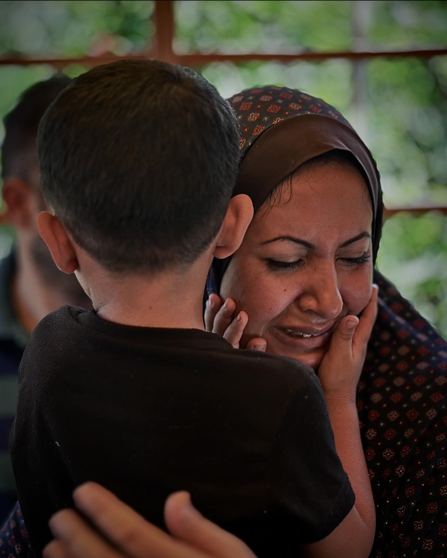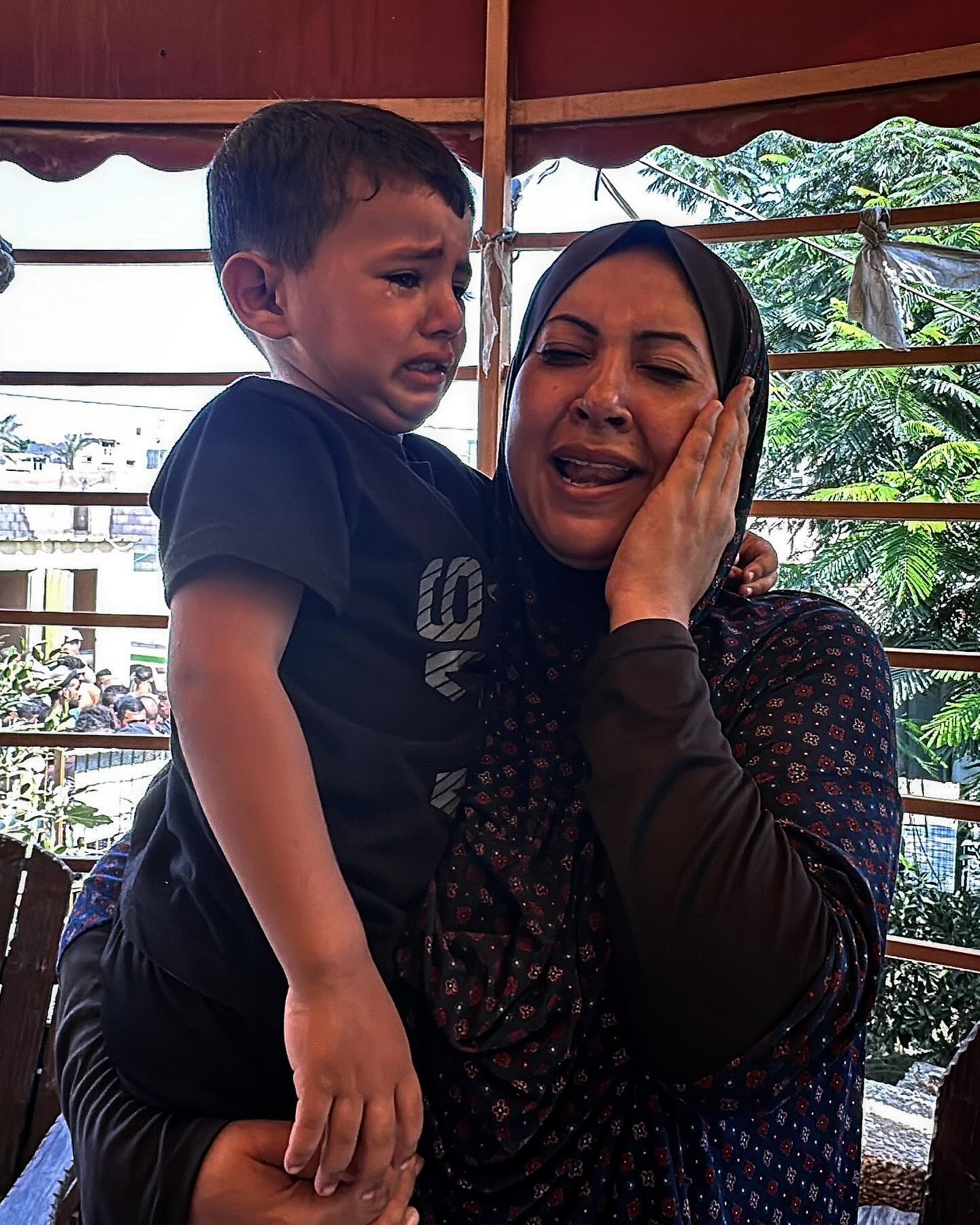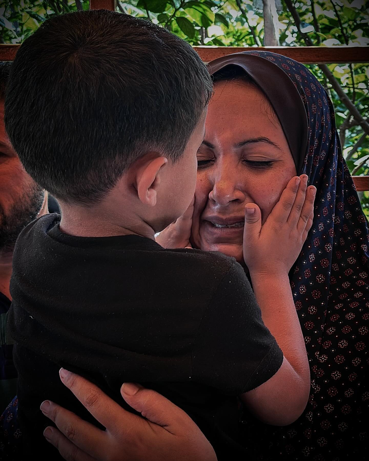 A young boy consoles his mother and wipes her tears after losing her family