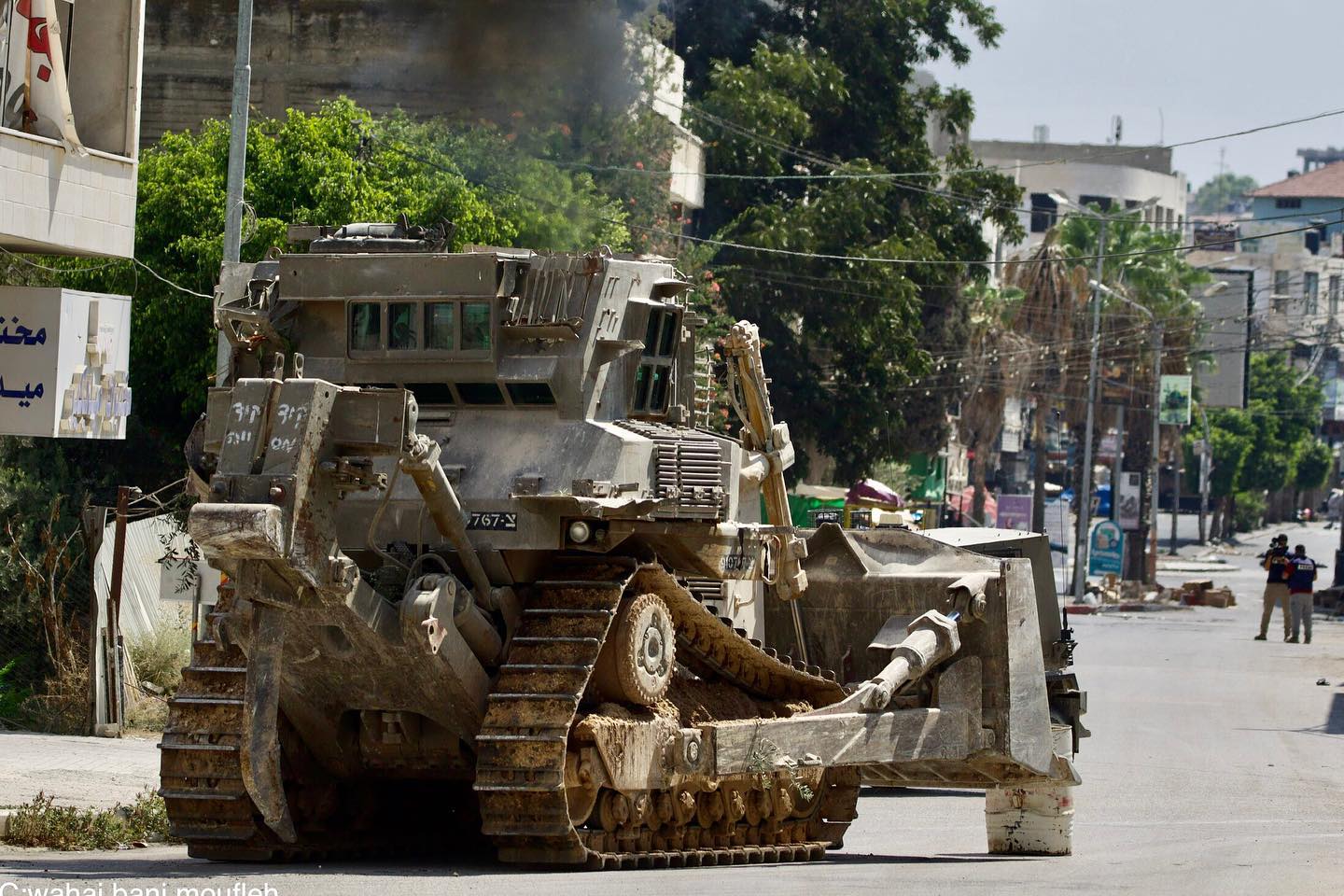An Israeli bulldozer razes streets in the eastern neighborhood of Jenin city. جرافة عسكرية تجرف الطرق في الحي الشرقي من مدينة جنين