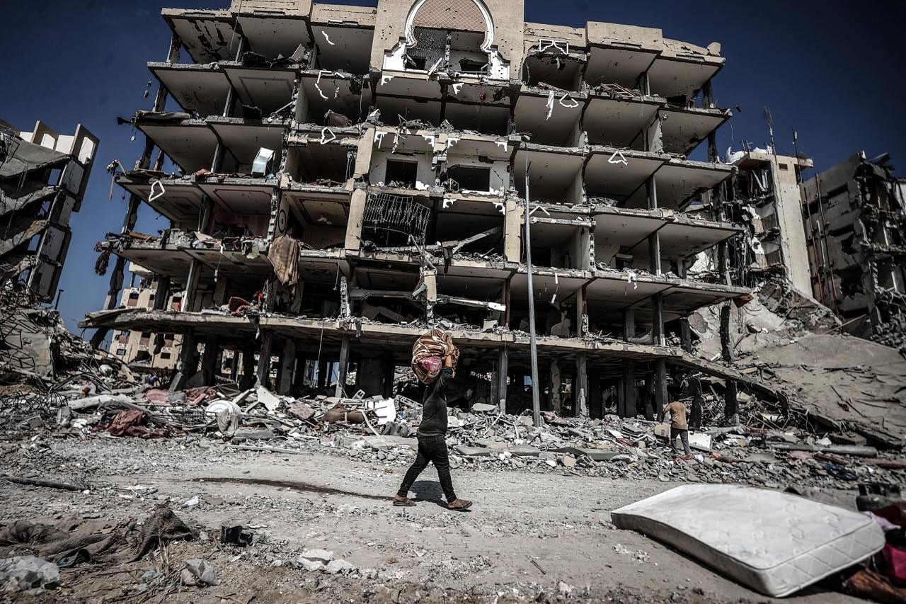 Palestinians remove whatever belongings they can salvage from the area as the devastation left by the Israeli army’s withdrawal comes to light in eastern Deir al-Balah, Gaza on August 29, 2024. Israeli attacks have left many buildings completely destroyed or severely damaged, and the infrastructure in the region has been heavily compromised. (Photo by Ali Jadallah/Anadolu via Getty Images)