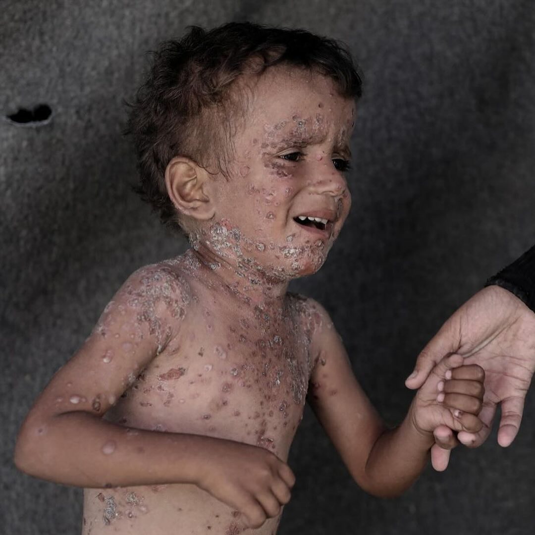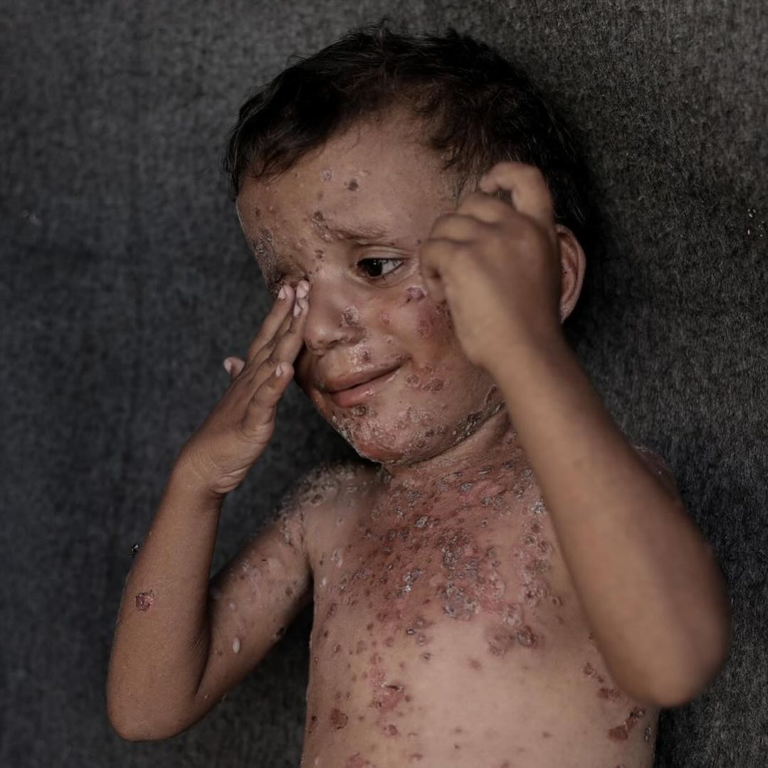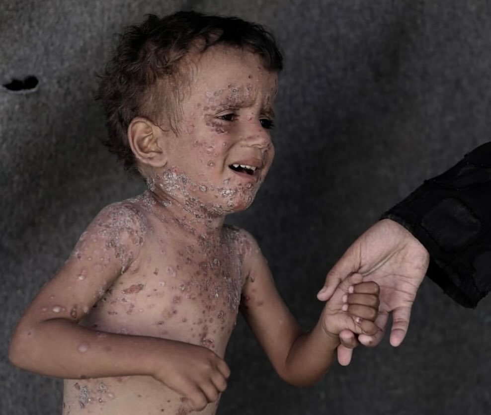 طفلٌ صغير بوجهٍ ملاكيّ، يُفترض أن يرتدي ثِيابًا جديدةً لأول يوم من المدرسة، لكِنّه هنا في غَزّة! يُعاني من طفحٍ جلديٍّ حادّ، بعد شهورٍ وشهورٍ من انقطاع المياه وصعوبة الاستحمام، وغياب الأدوية في ظل الحصار، لا يملك إلّا أن يبكي وجعًا. رقم التواصل مع عائلة فايز : 00972592458762 Six-year-old Fayez suffers from severe rashes all over his body. The boy cannot even sleep because of the pain, and his family is unable to provide him with the necessary medications. Due to the high temperatures and lack of hygiene in the tents, many children suffer from various skin diseases and infections that spread among them, with no cures or medicines available to treat them. Contact Fayez's family: 00972592458762 By: @abdalhkem_abu_riash