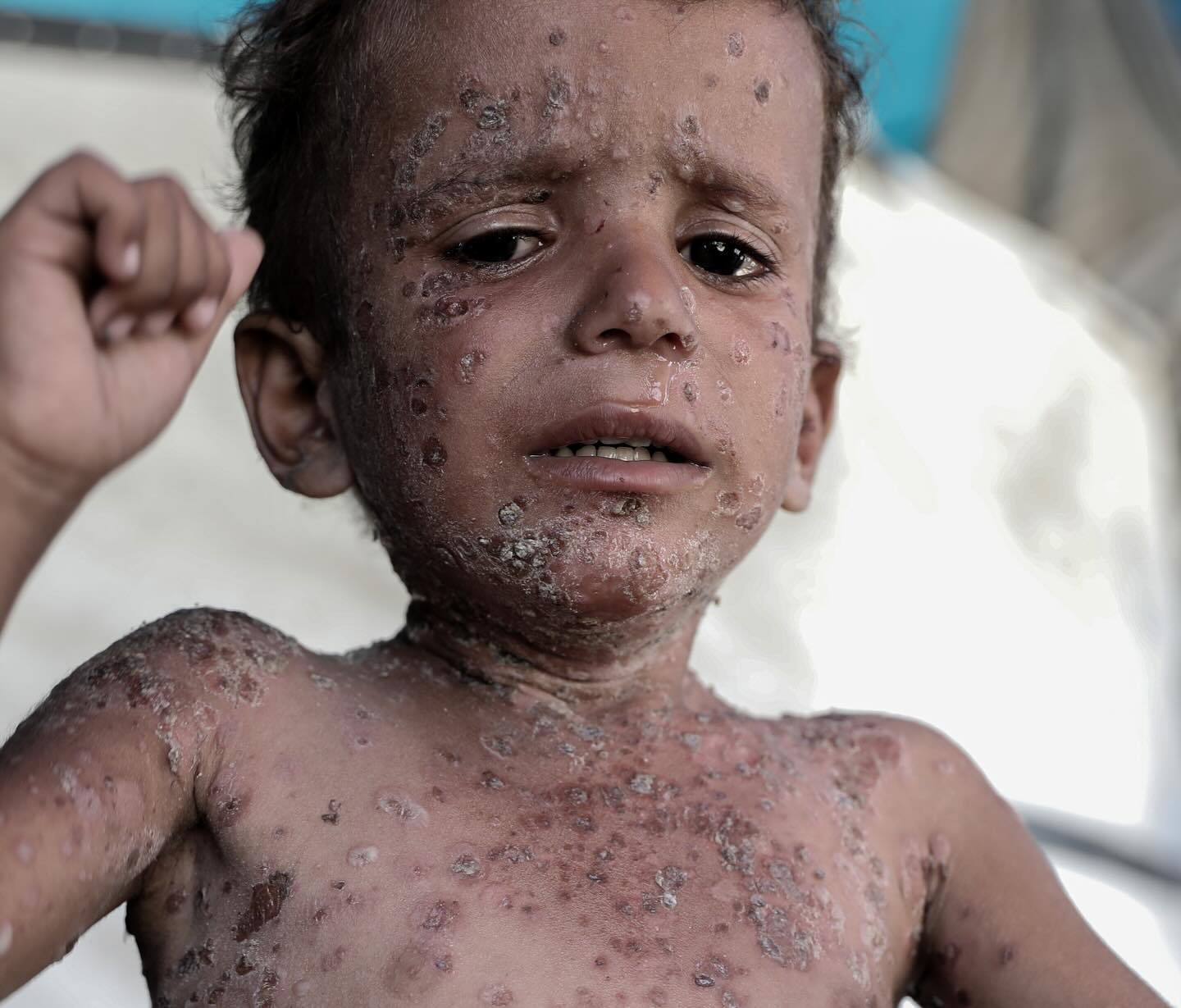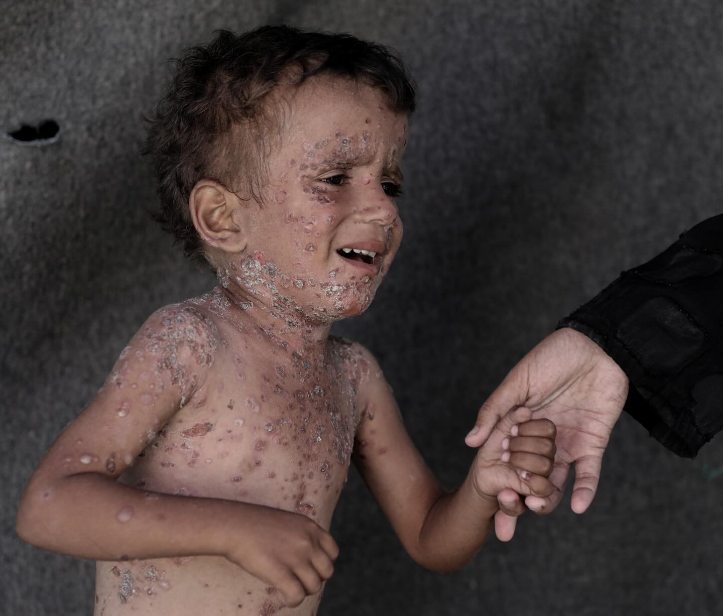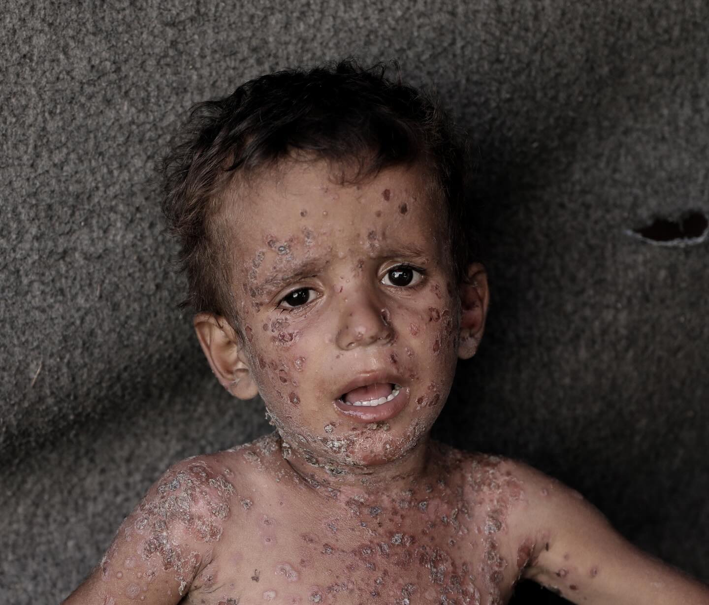 طفلٌ صغير بوجهٍ ملاكيّ، يُفترض أن يرتدي ثِيابًا جديدةً لأول يوم من المدرسة، لكِنّه هنا في غَزّة! يُعاني من طفحٍ جلديٍّ حادّ، بعد شهورٍ وشهورٍ من انقطاع المياه وصعوبة الاستحمام، وغياب الأدوية في ظل الحصار، لا يملك إلّا أن يبكي وجعًا. رقم التواصل مع عائلة فايز : 00972592458762 Six-year-old Fayez suffers from severe rashes all over his body. The boy cannot even sleep because of the pain, and his family is unable to provide him with the necessary medications. Due to the high temperatures and lack of hygiene in the tents, many children suffer from various skin diseases and infections that spread among them, with no cures or medicines available to treat them. Contact Fayez's family: 00972592458762 By: @abdalhkem_abu_riash