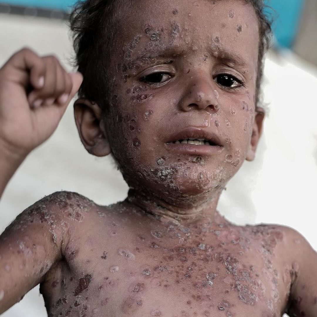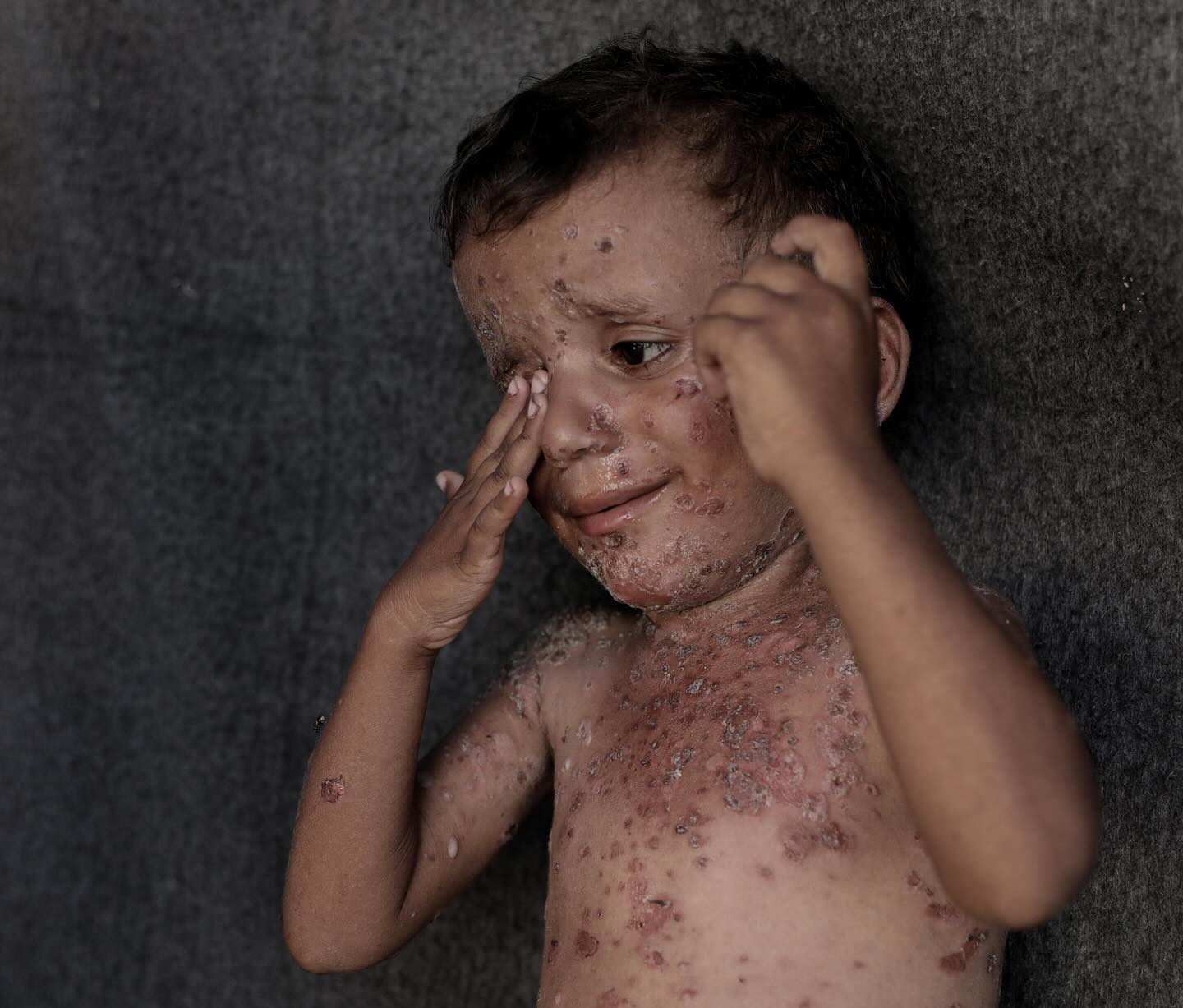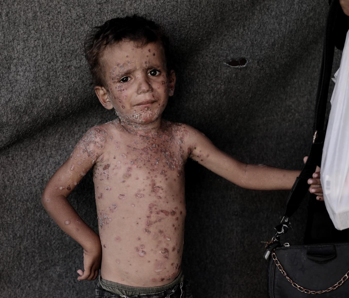 Six year-old Fayez suffers with severe rashes all over his body. The boy cannot even sleep because of the pain, where his family is unable to provide him the needed medications. Due to the high temperature and lack of hygiene in tents, many children suffer from various skin diseases and infections that are widespread among them with no cures or medicines available to treat them. By @abdalhkem_abu_riash يعاني فايز البالغ من العمر ست سنوات من طفح جلدي شديد في جميع أنحاء جسده. لا يستطيع الصبي حتى النوم بسبب الألم، حيث لا تستطيع عائلته تزويده بالأدوية اللازمة. بسبب ارتفاع درجة الحرارة ونقص النظافة في الخيام، يعاني العديد من الأطفال من مختلف الأمراض الجلدية والالتهابات المنتشرة بينهم دون أي علاجات أو أدوية متاحة لعلاجهم