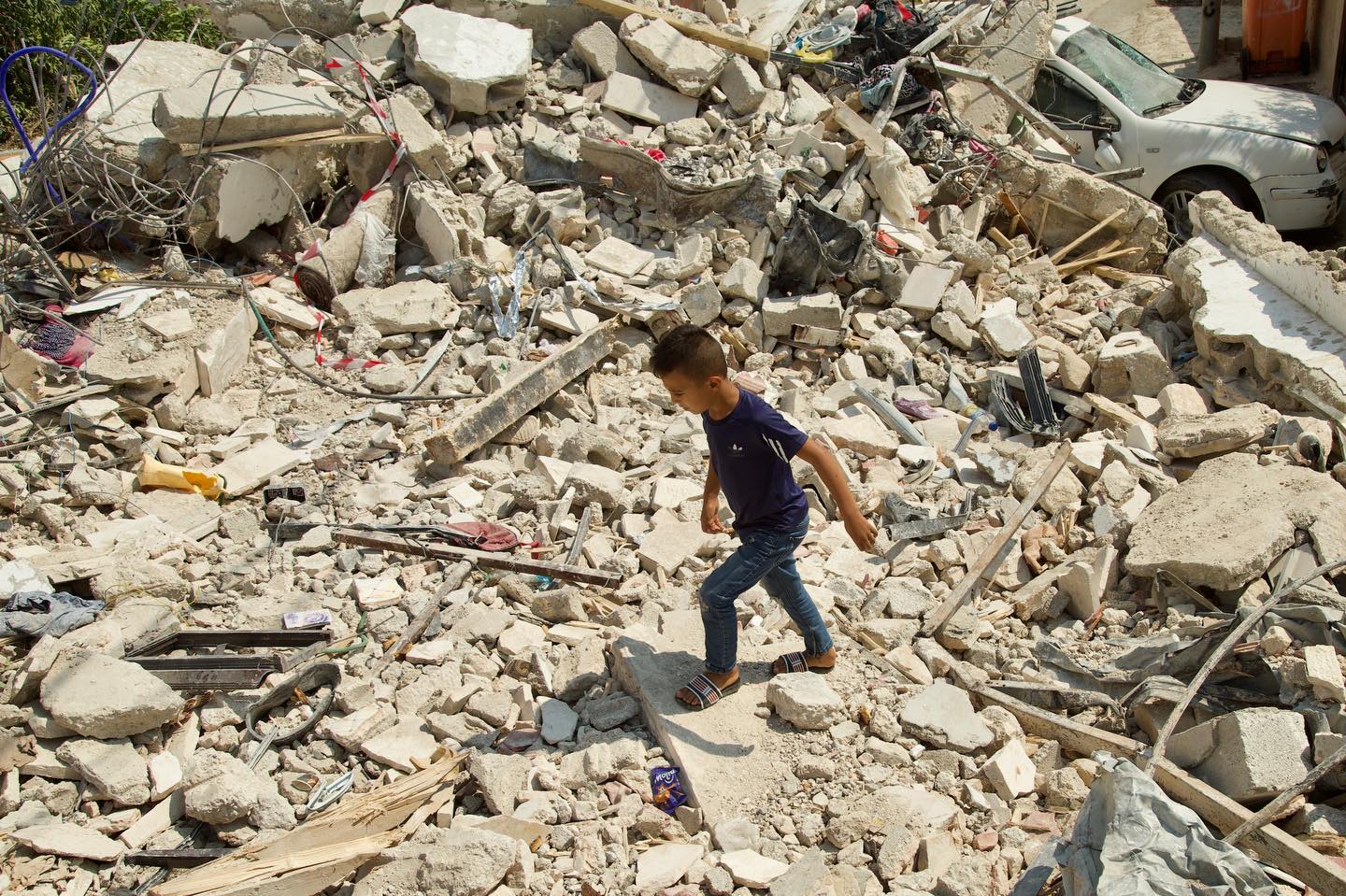 A Palestinian family lives in a destroyed home in Gaza. عائلة تعيش في منزل مدمر في غزة