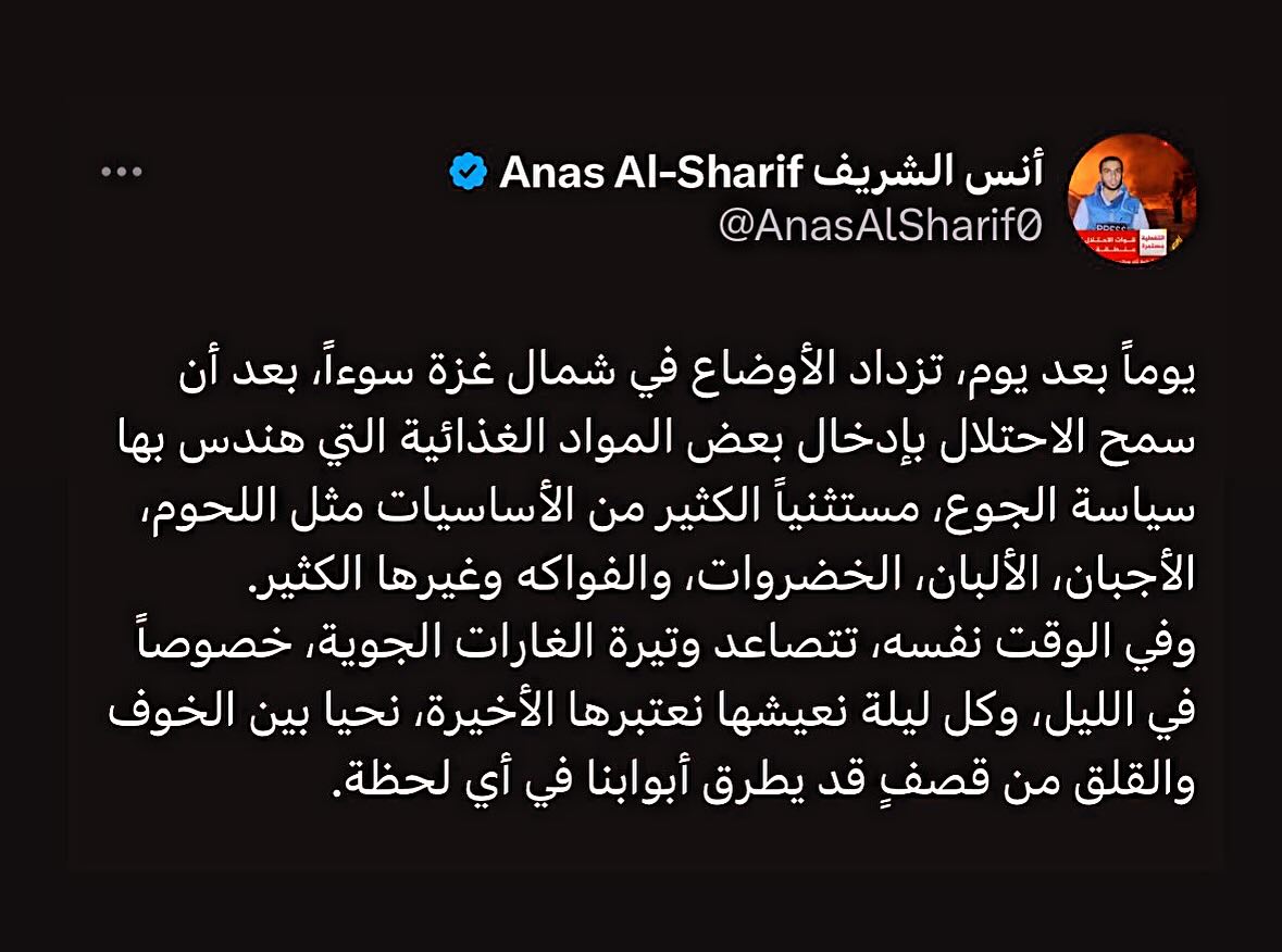 يوماً بعد يوم، تزداد الأوضاع في شمال غزة سوءاً، بعد أن سمح الاحتلال بإدخال بعض المواد الغذائية التي هندس بها سياسة الجوع، مستثنياً الكثير من الأساسيات مثل اللحوم، الأجبان، الألبان، الخضروات، والفواكه وغيرها الكثير. وفي الوقت نفسه، تتصاعد وتيرة الغارات الجوية، خصوصاً في الليل، وكل ليلة نعيشها نعتبرها الأخيرة، نحيا بين الخوف والقلق من قصفٍ قد يطرق أبوابنا في أي لحظة.