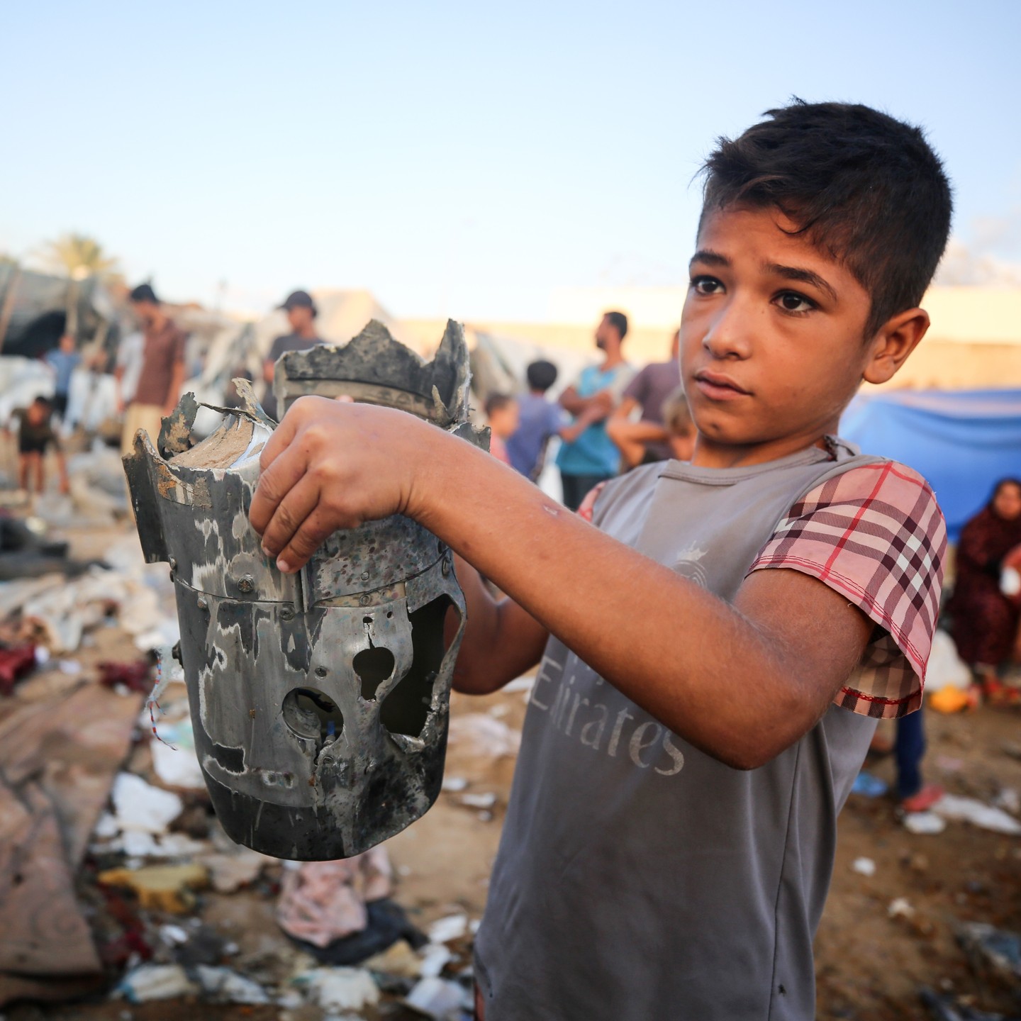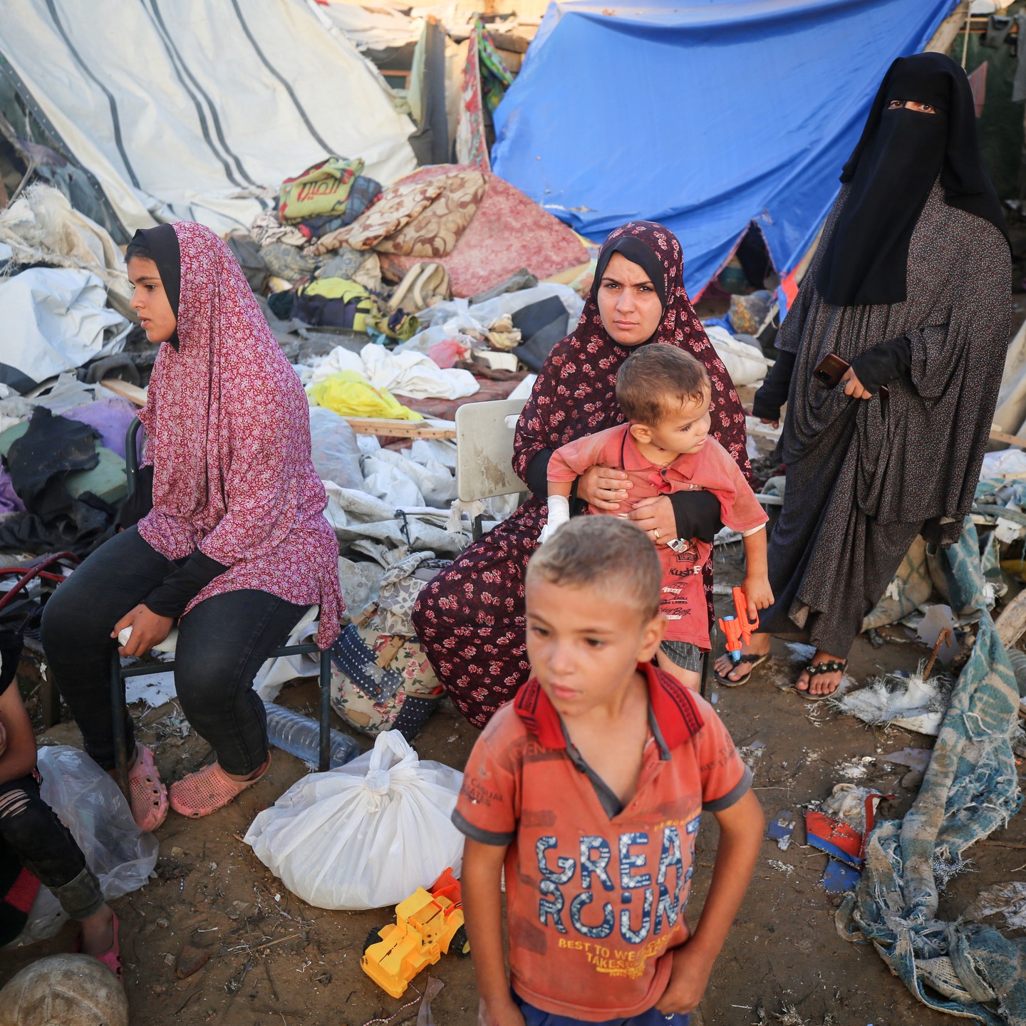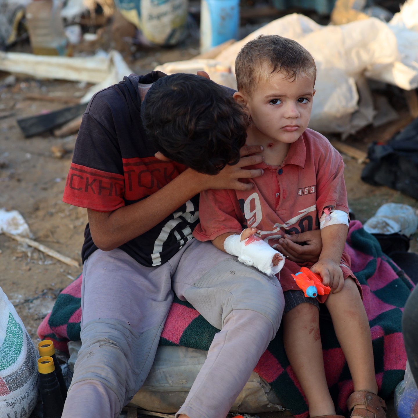 Palestinian children inspect their toys following the Israeli air strike that targeted the tents of displaced Palestinians in the courtyards of Al Aqsa hospital in Deir Al Balah, central Gaza Strip. By @abdallah_alattar1999 الدمار جراء استهداف الاحتلال خيام النازحين داخل مستشفى شهداء الاقصى في دير البلح