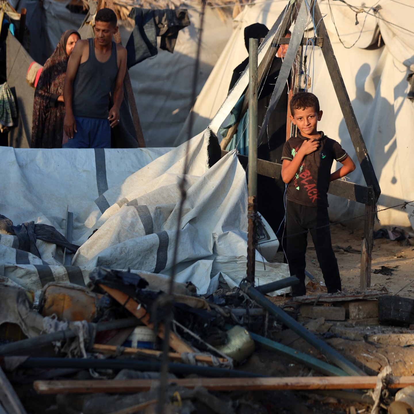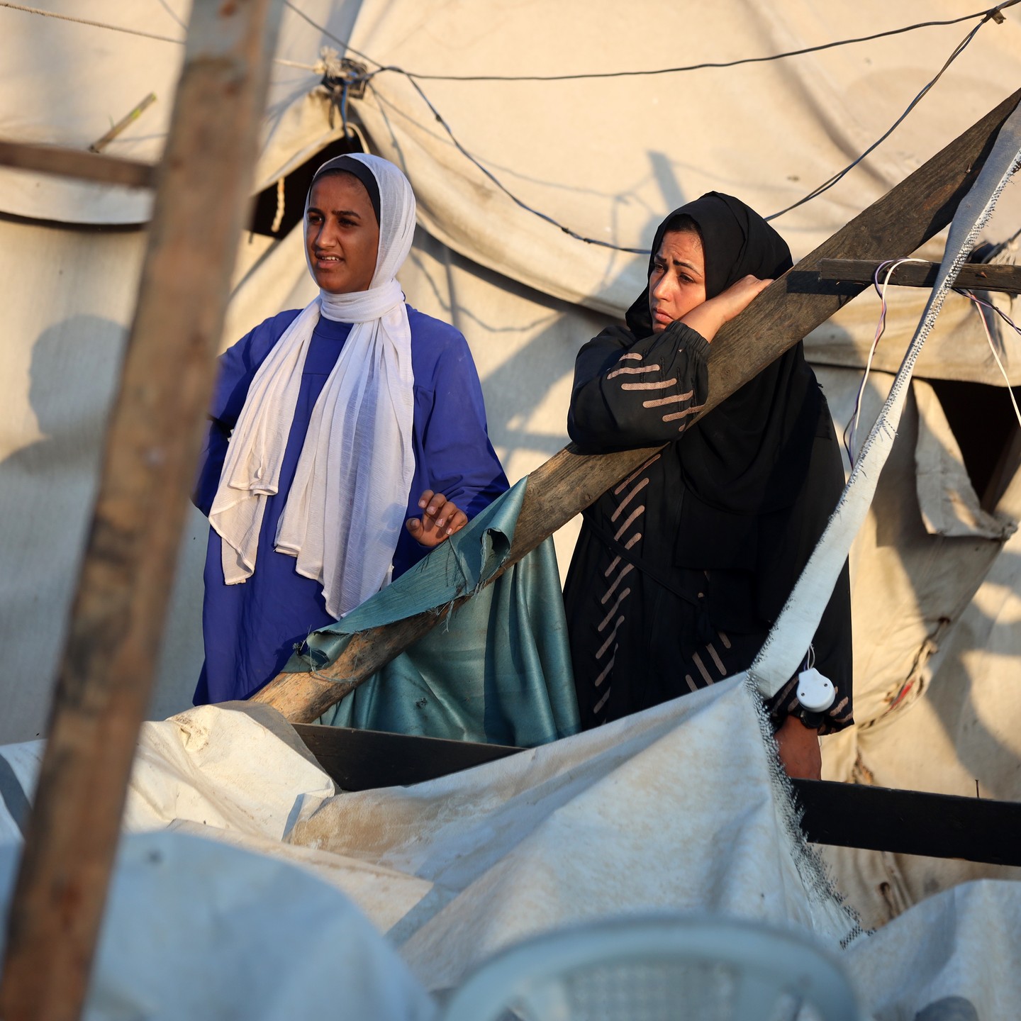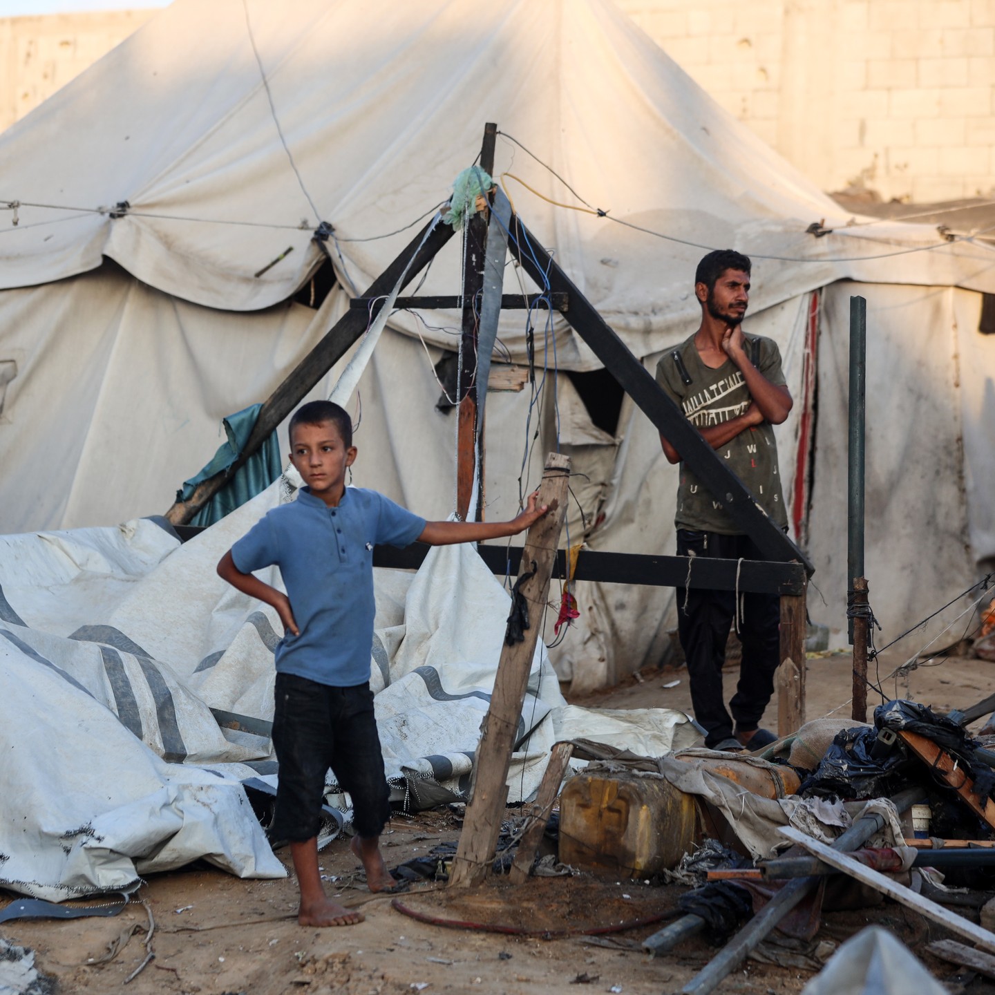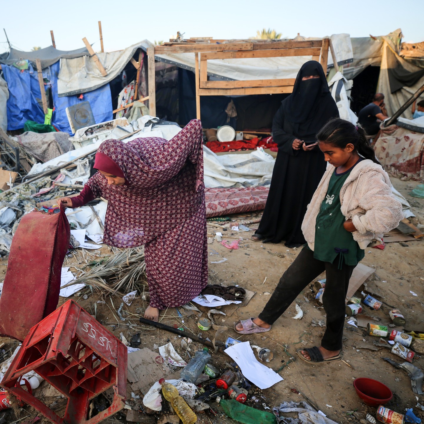 A Palestinian family prepares breakfast in one of the strange tents, Khan Younis, southern Gaza Strip . By Mohammed Zaanoun