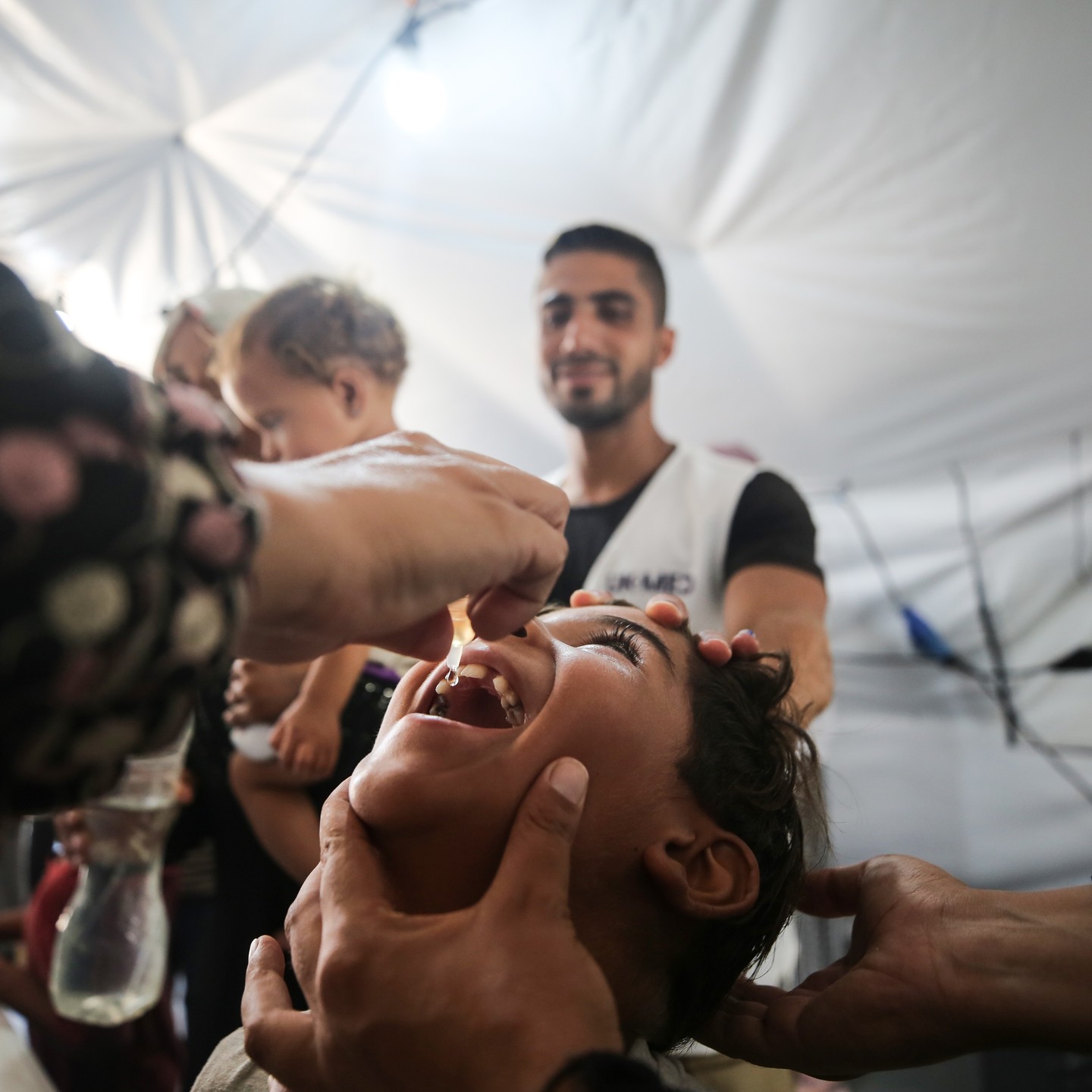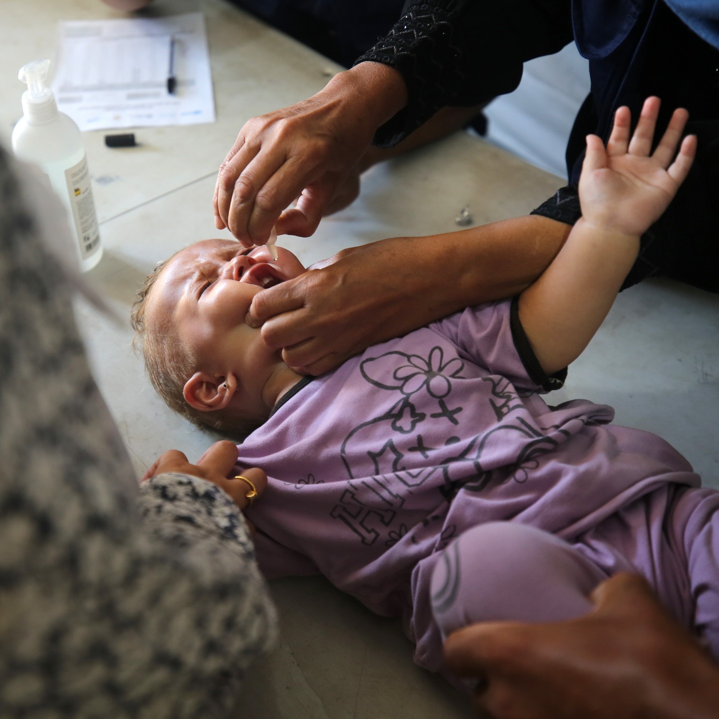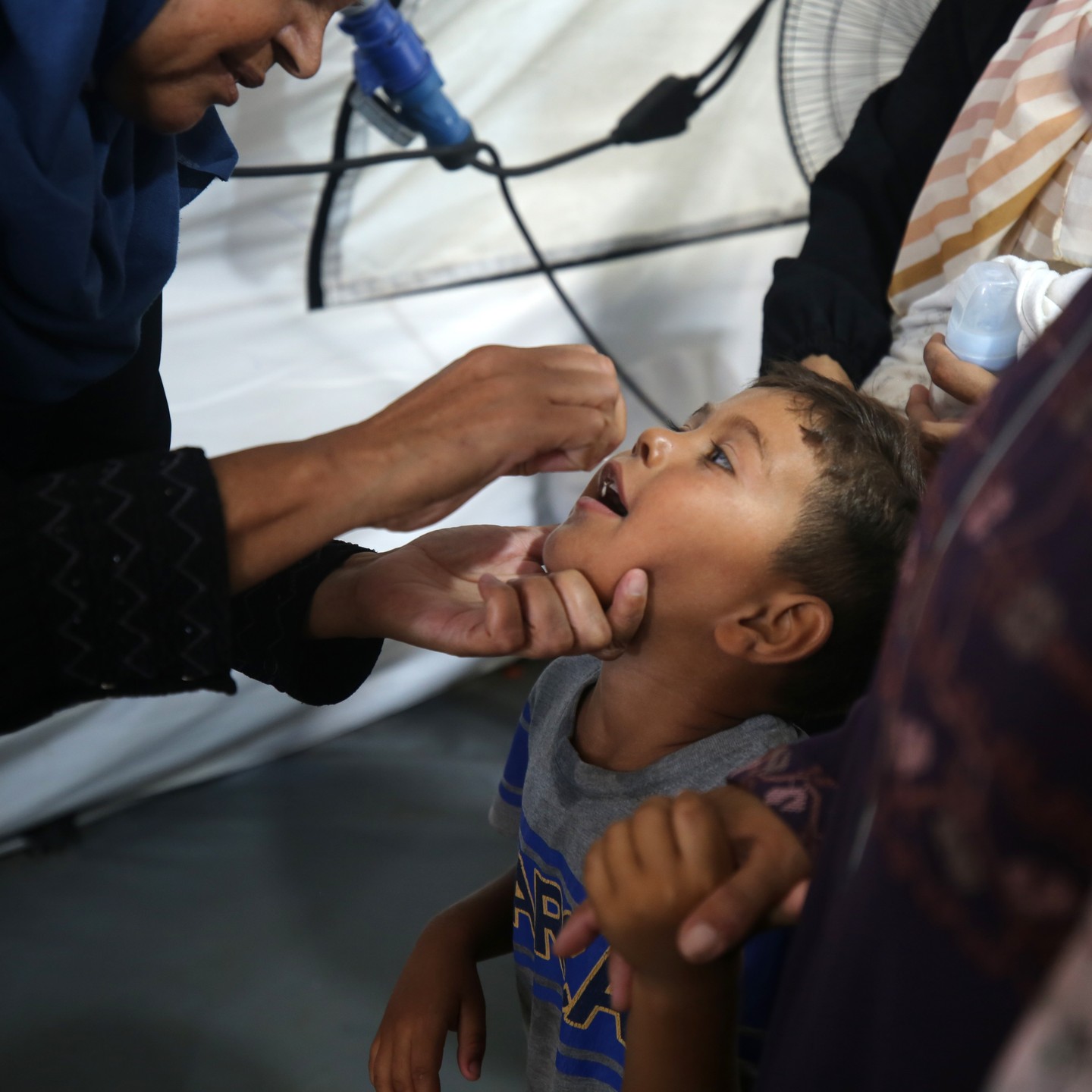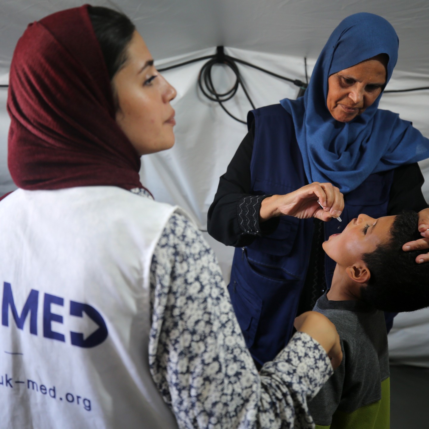 A Palestinian child receives a polio vaccination in the UK-MED field hospital in Khan Younis in the southern Gaza Strip, September 5, 2024, photo by majdi fathi @uk_med
