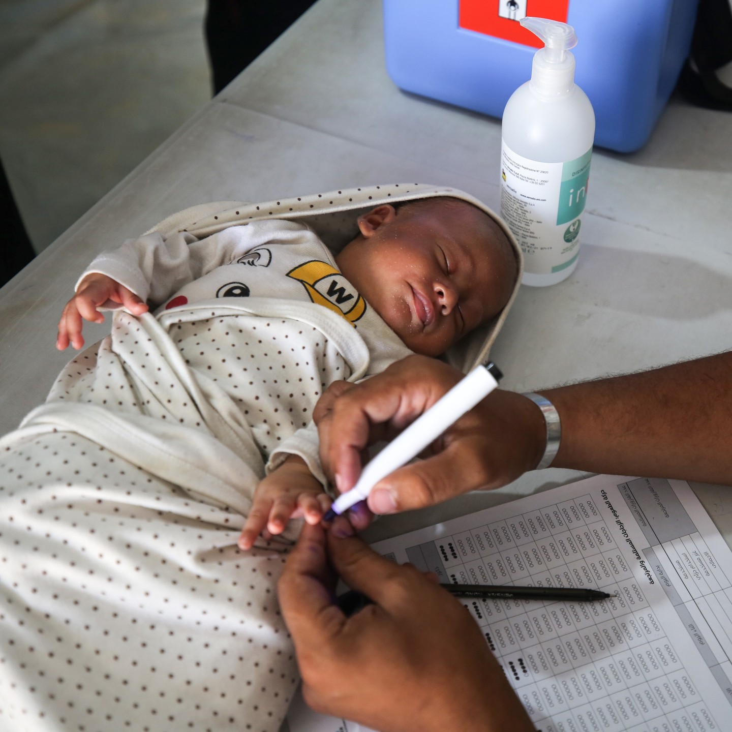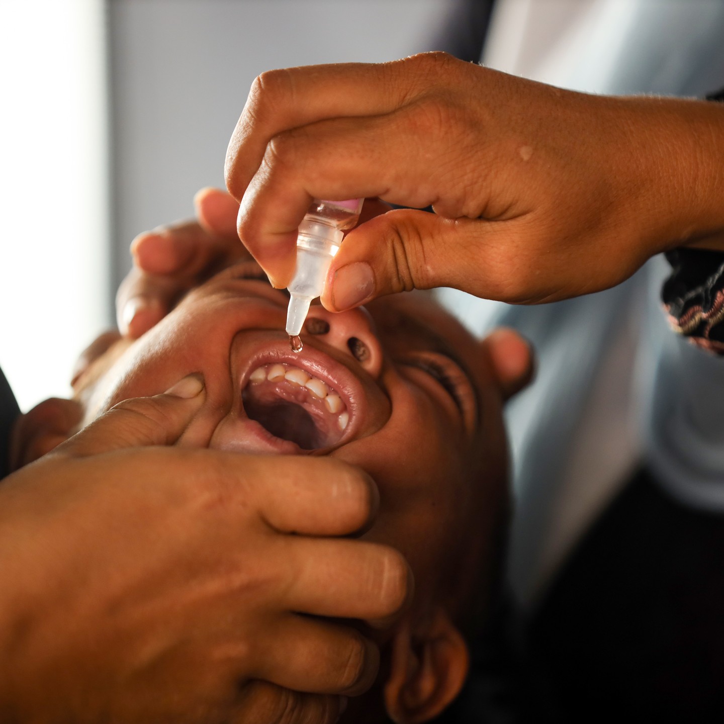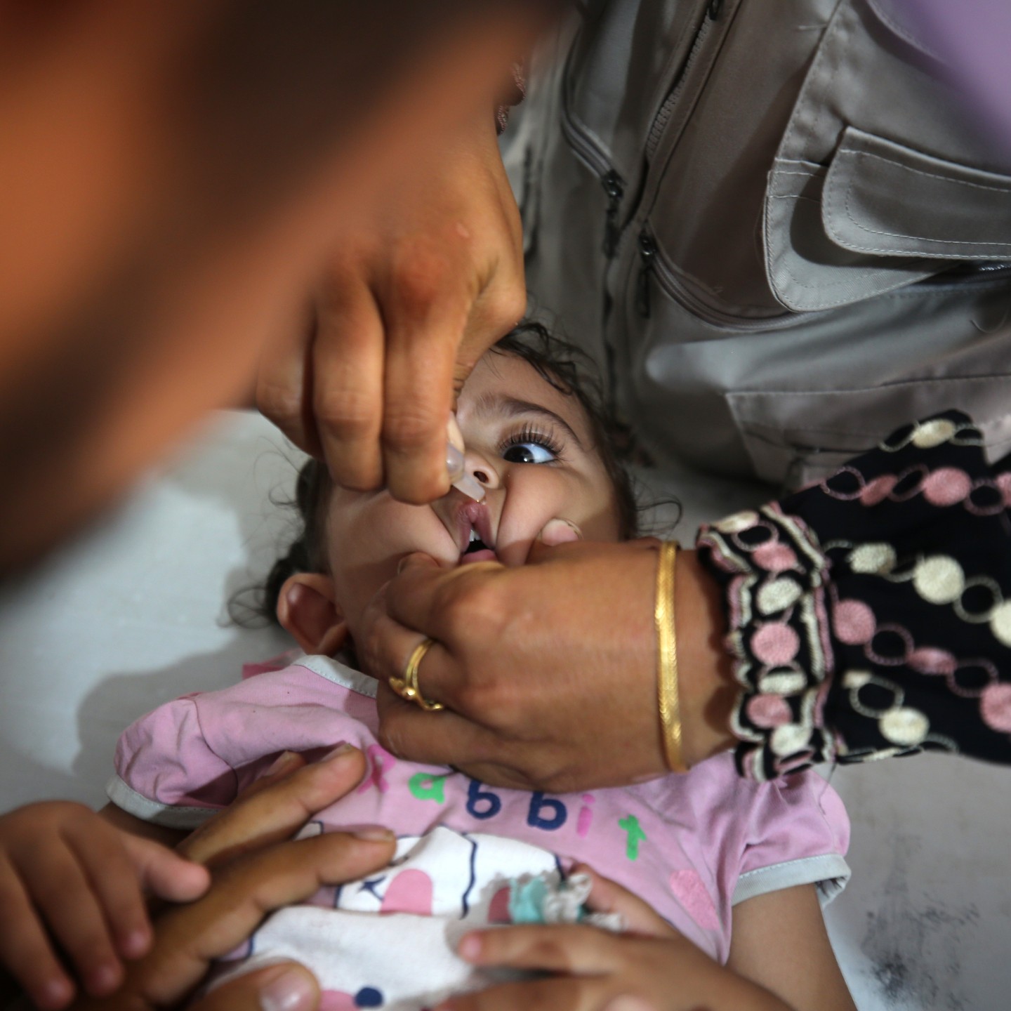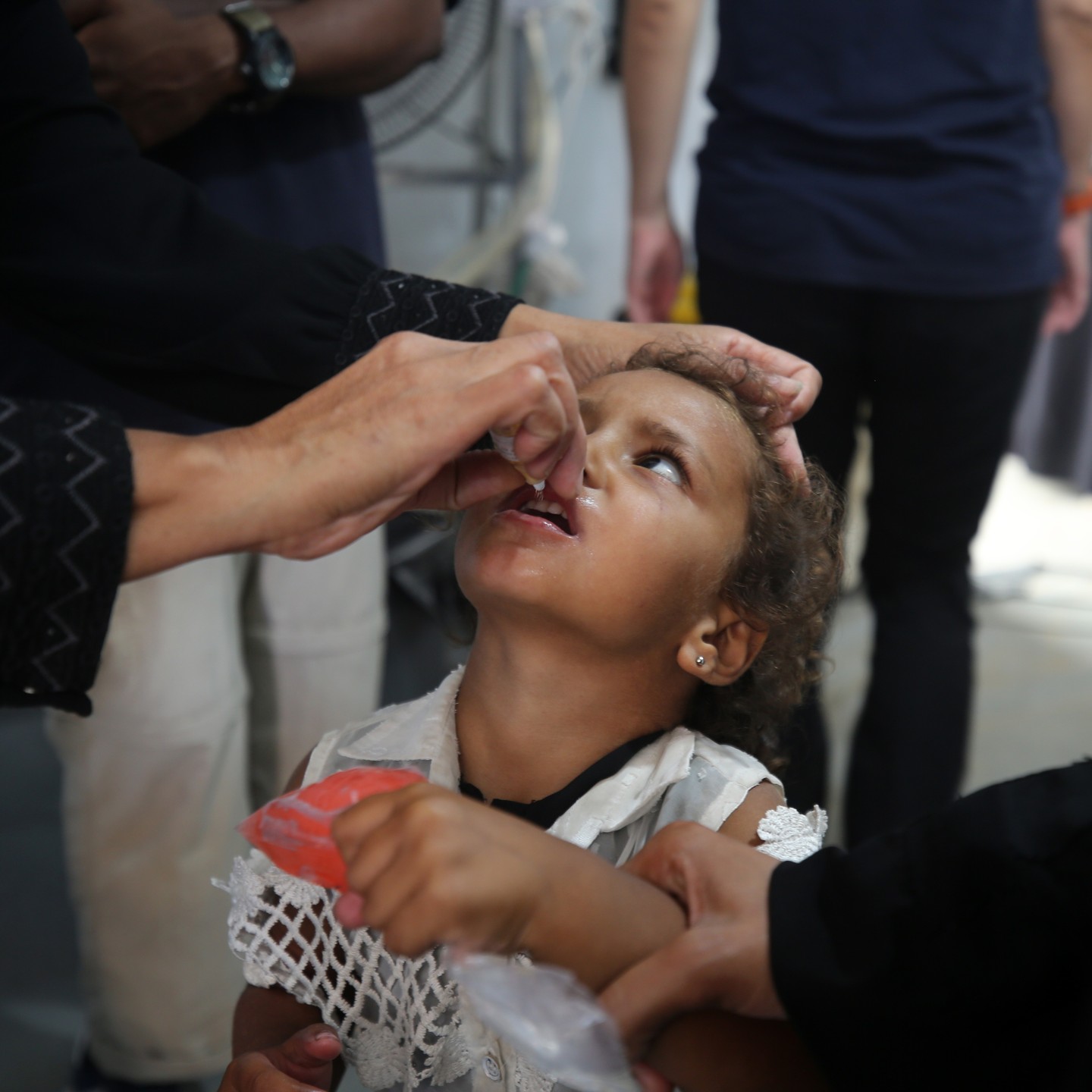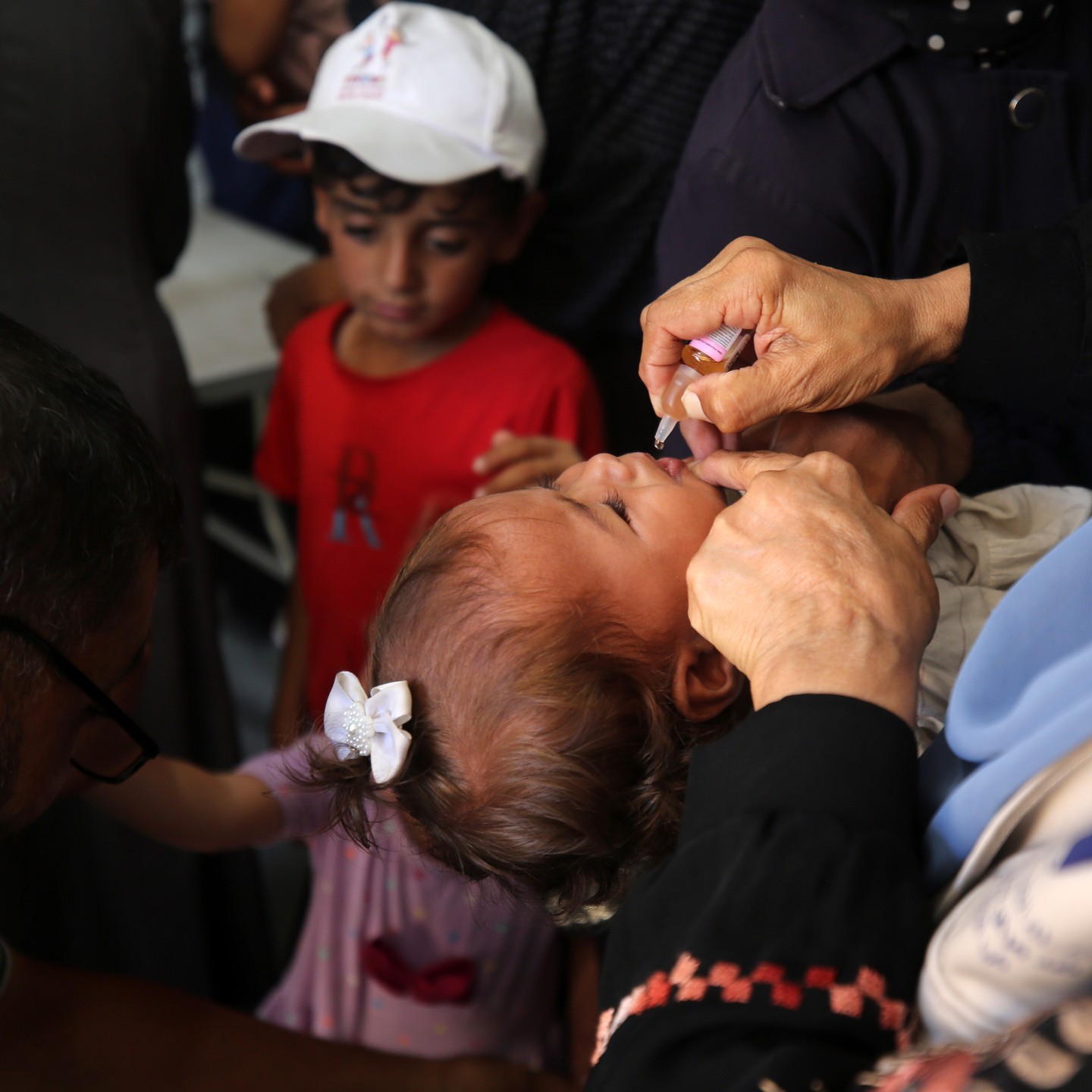 A Palestinian child receives a polio vaccination in the UK-MED field hospital in Khan Younis in the southern Gaza Strip, September 5, 2024, photo by majdi fathi @uk_med
