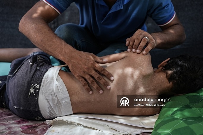 As a result of a bullet fired by an Israeli occupation drone, his spinal cord was hit... The displaced child, Qais Abu Al-Qumsan, is facing the risk of permanent paralysis for the rest of his life. جراء رصاصة اطلقتها مسيّرة الاحتلال الإسرائيلية وأصابت عموده الفقري .. الطفل النازح قيس أبو القمصان يواجه خطر الشلل الدائم مدى الحياة.