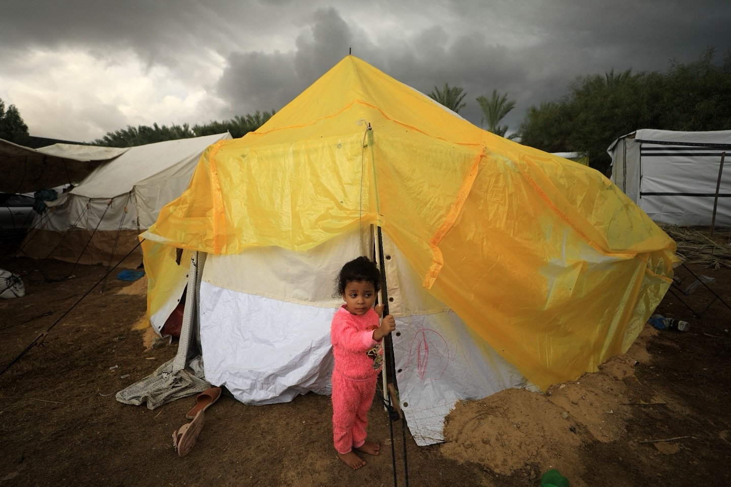 A displaced Gazan girl stands in front of her tent in Khan Yunis, as winter approaches. Photo: Yasser Qudih طفلة غزية نازحة تقف امام خيمتها في مدينه خان يونس ، اقتراب فصل الشتاء تصوير/ياسر قديح
