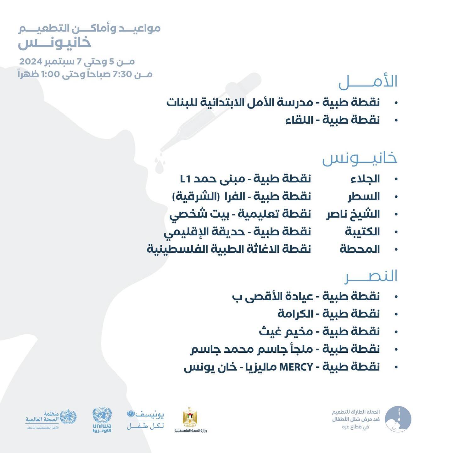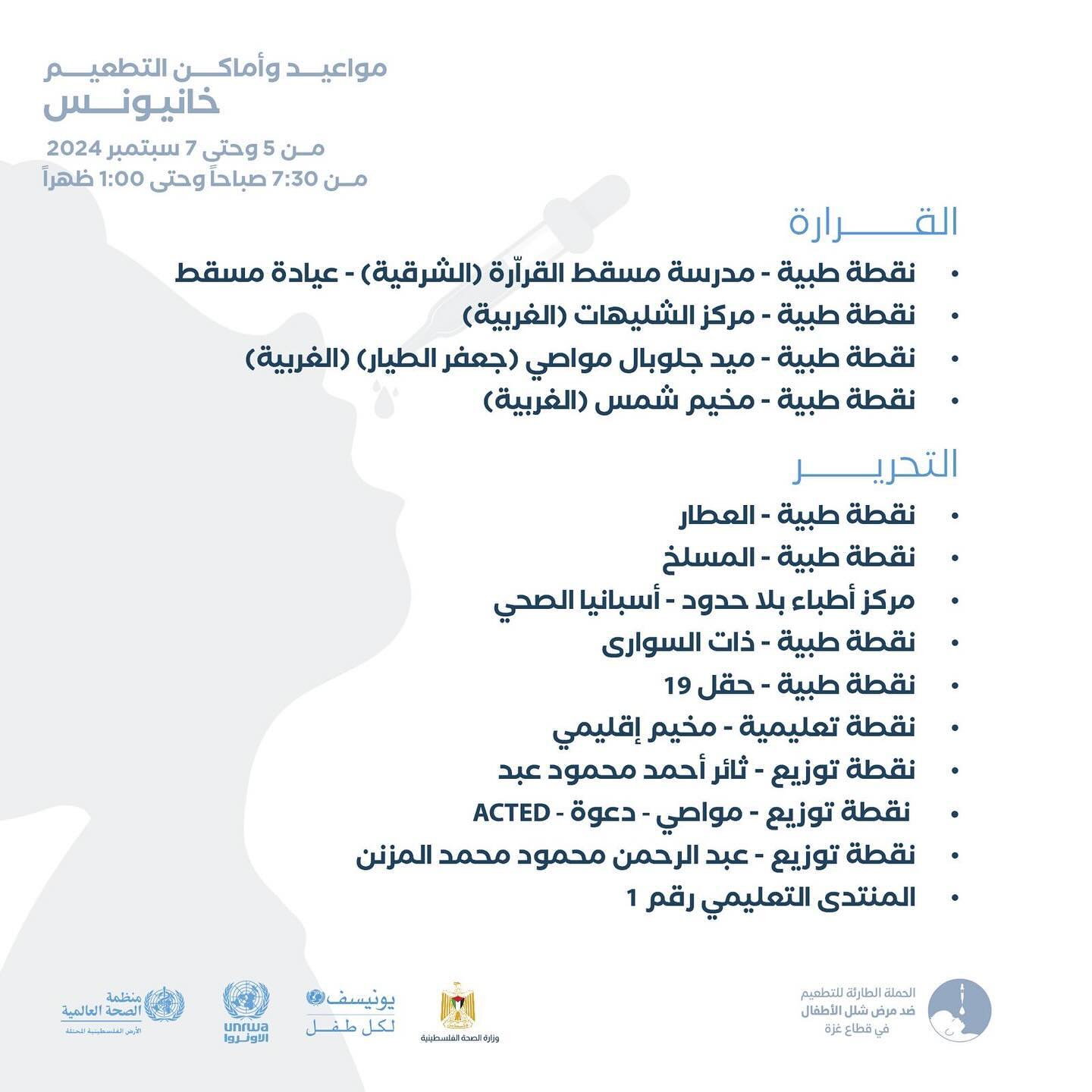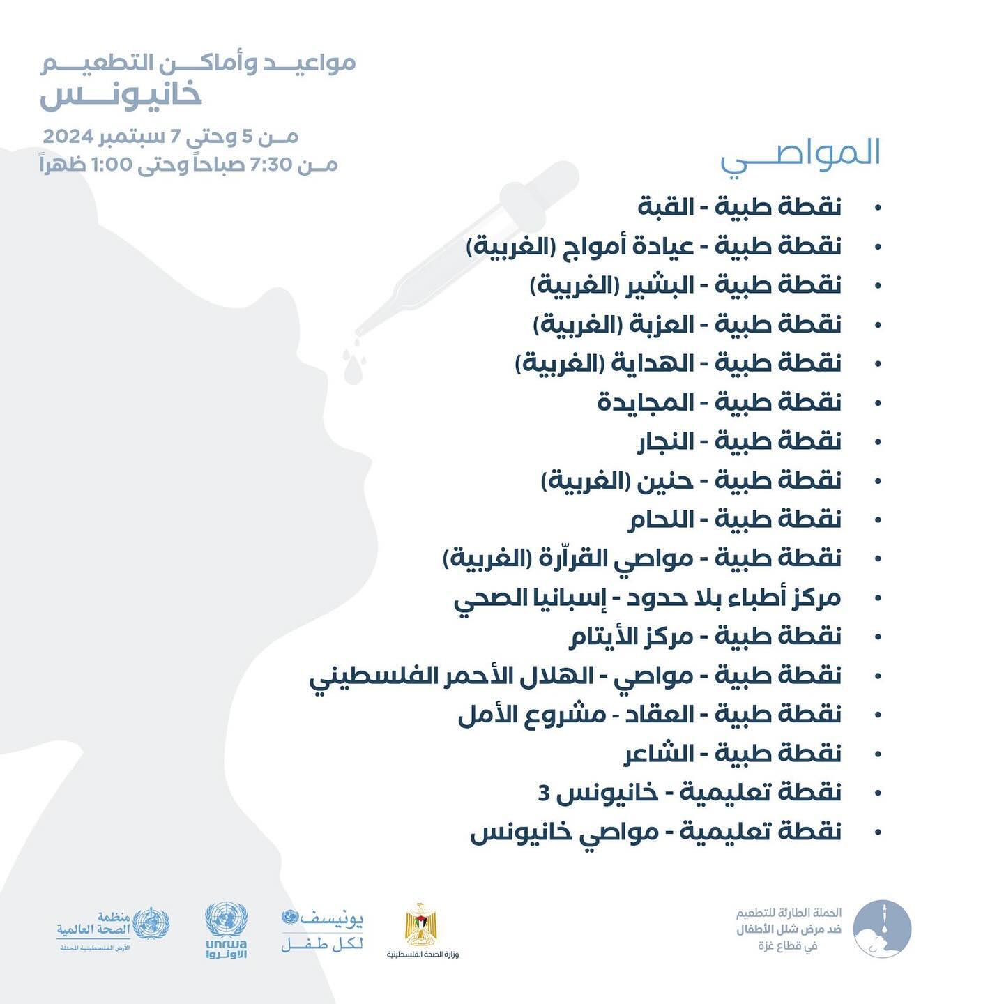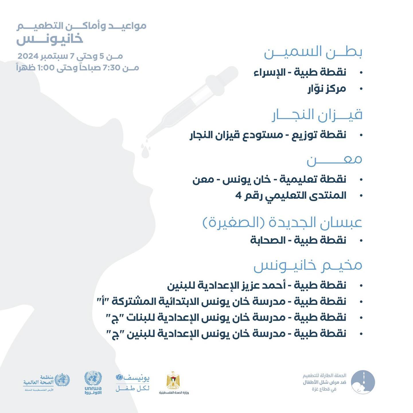 مواعيد و أماكن التطعيم ضد شلل الأطفال من عمر 0-10 سنوات في خانيونس، من اليوم وحتى 9 September.