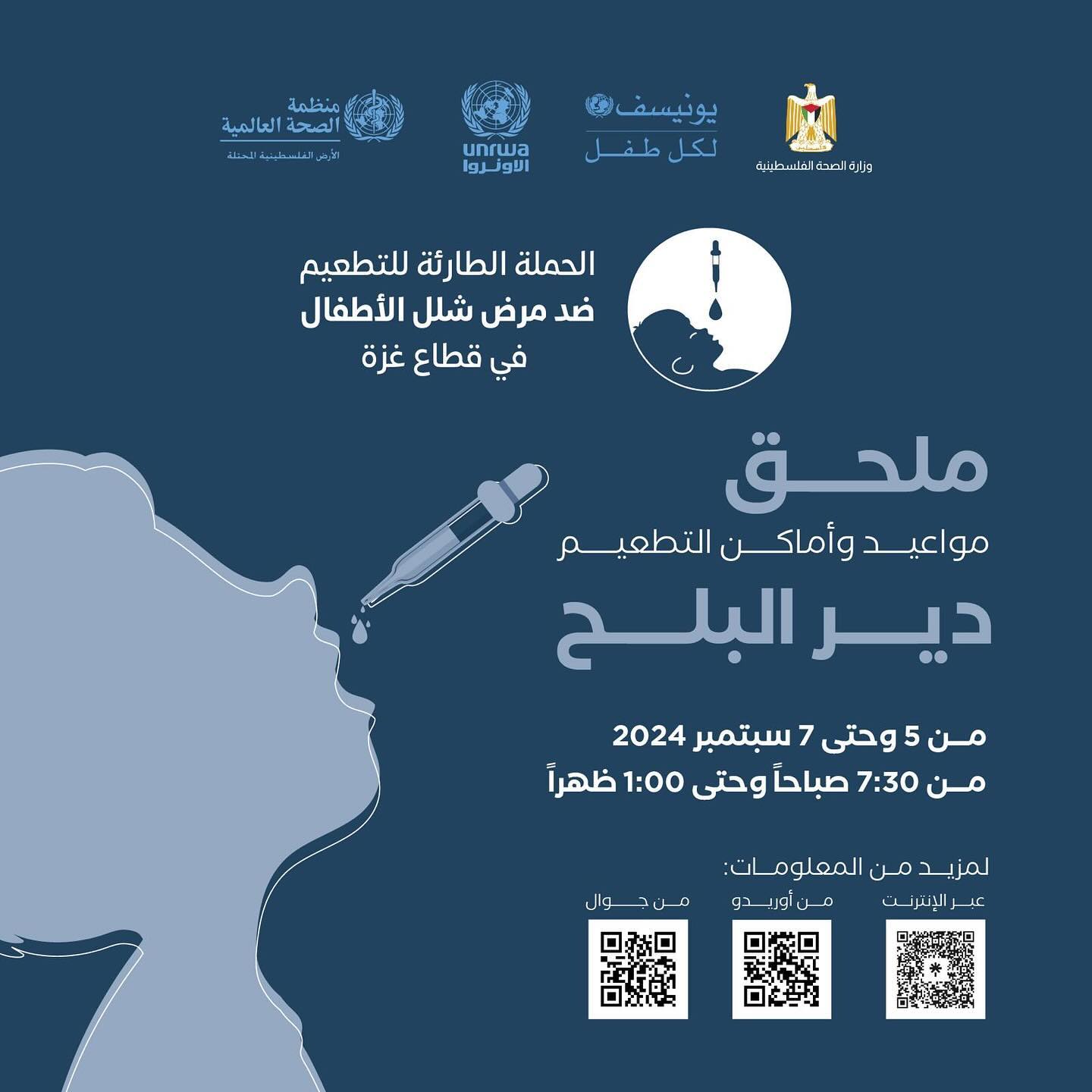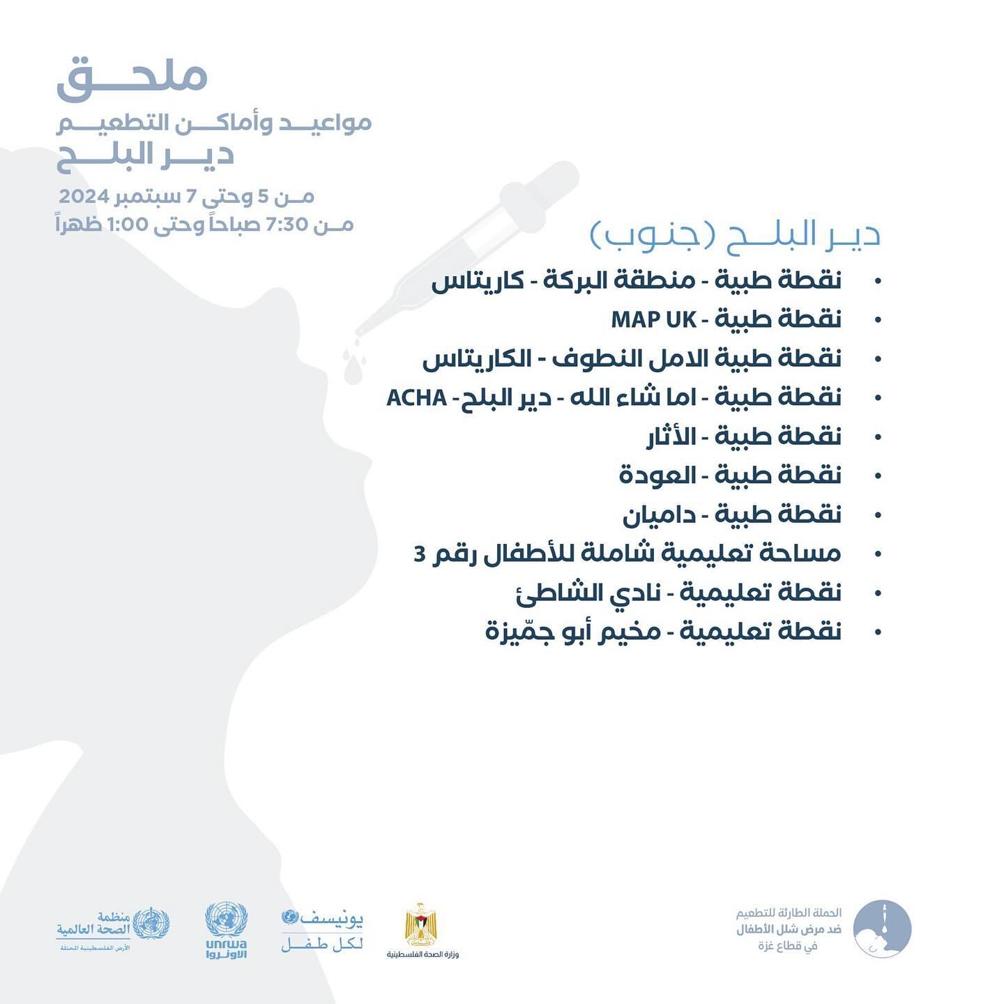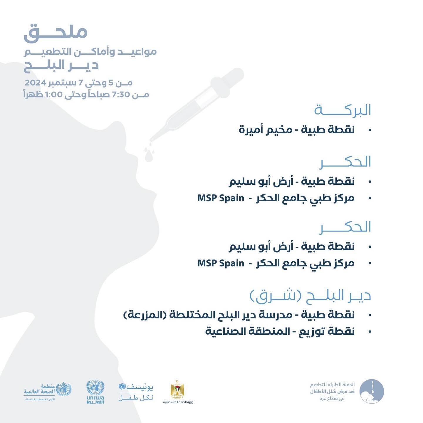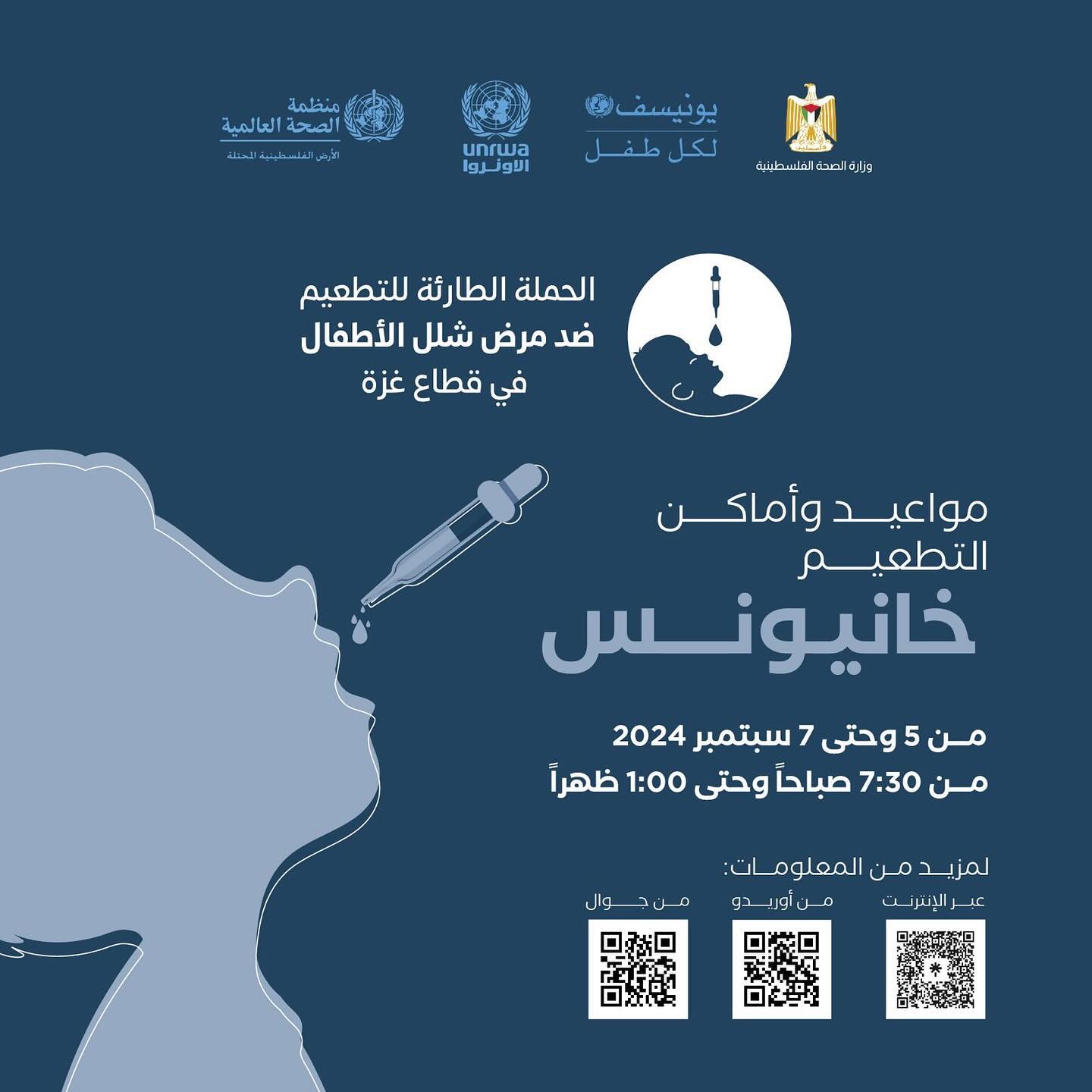 مواعيد و أماكن التطعيم ضد شلل الأطفال من عمر 0-10 سنوات في خانيونس، من اليوم وحتى 9 September.